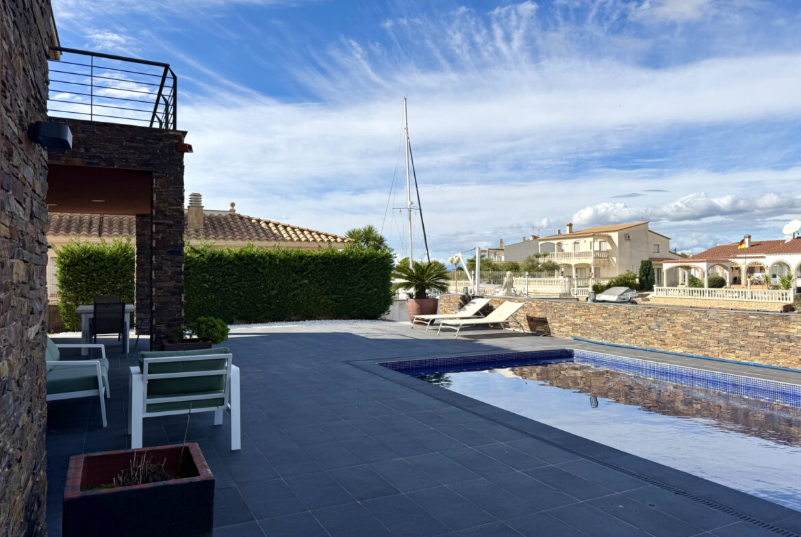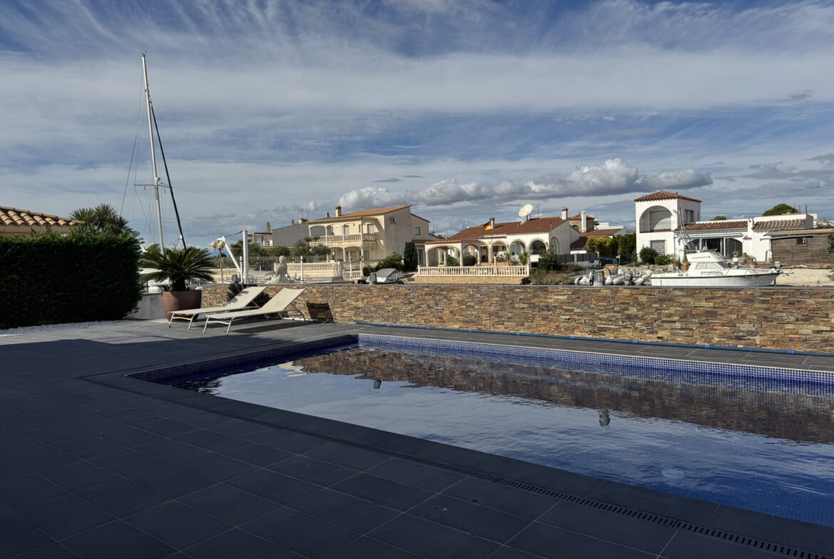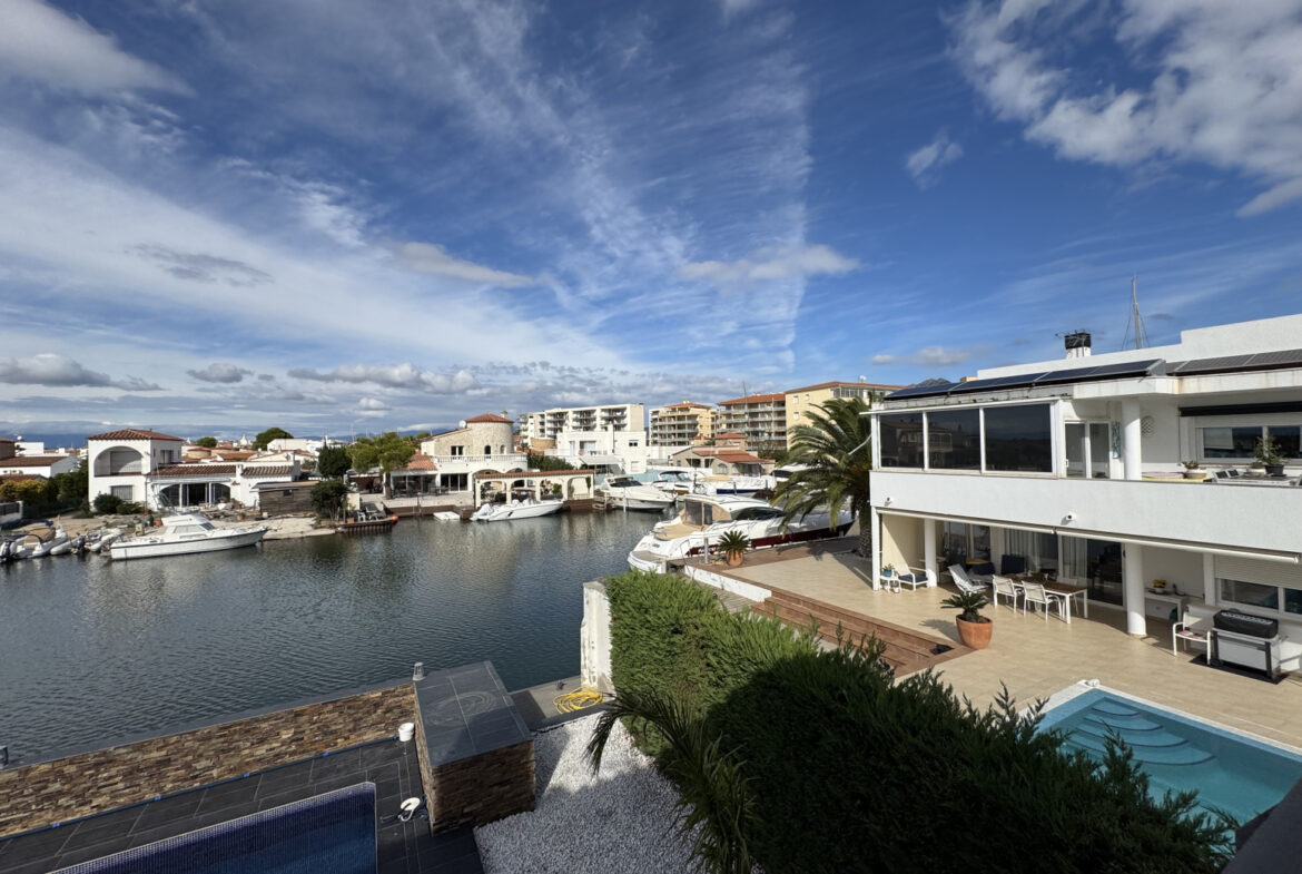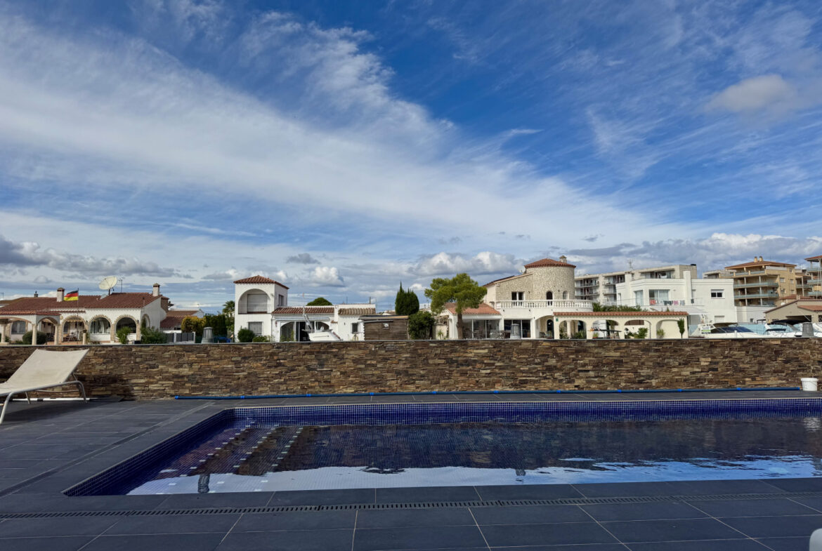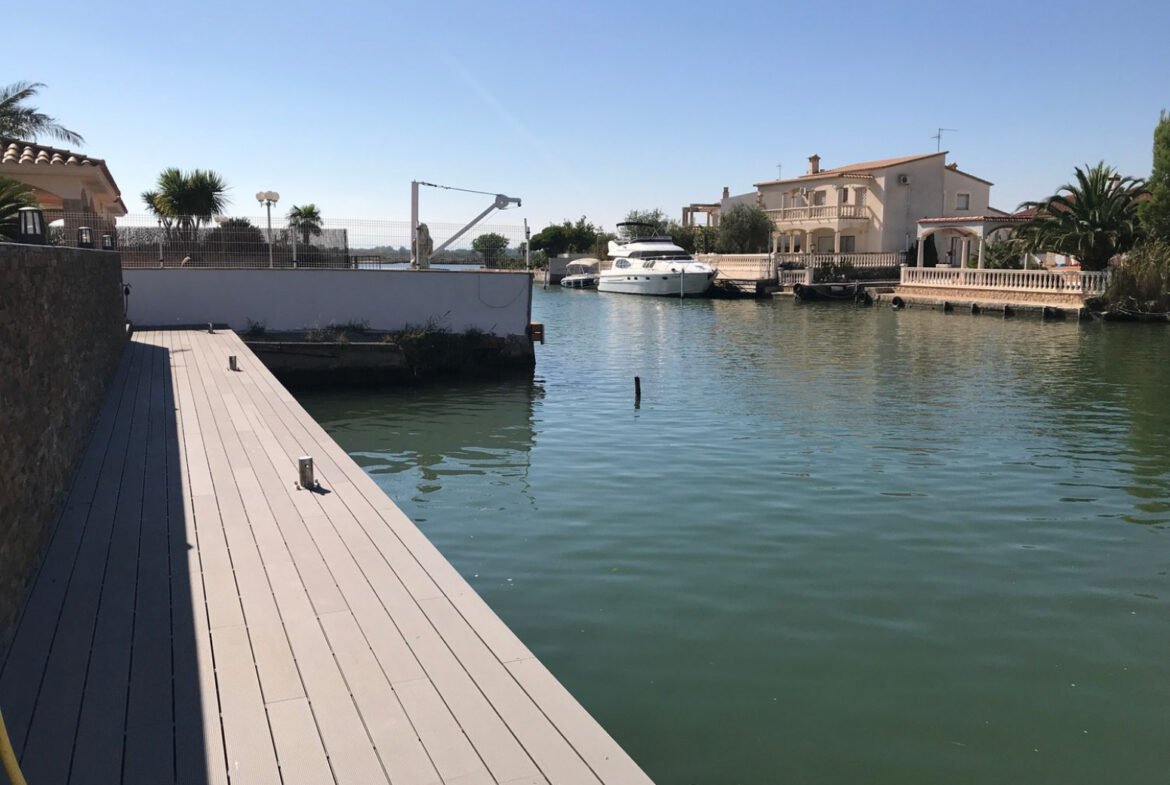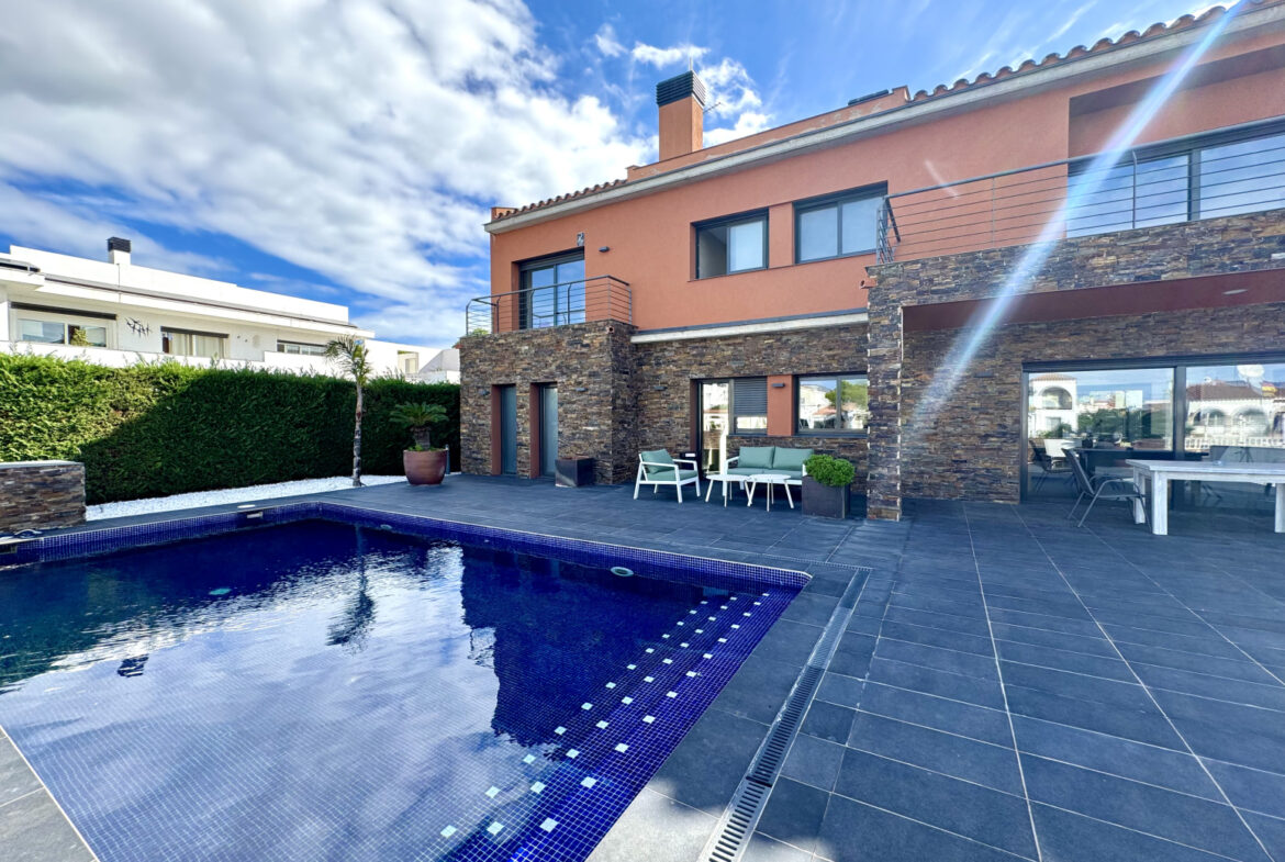 RV01 – Roses; Santa Margarida: Casa en el canal con 20 metros de amarre a la venta. Ideal para catamarán de grandes dimensiones.En la marina residencial de Santa Margarida, en Roses, se encuentra esta bonita casa de nueva construcción.Esta propiedad dispone de un amarre privado para que pueda disfrutar de su yate o velero. Puede acoger embarcaciones de hasta 20 m, a motor o de vela. En la gran terraza disfrutará de las bonitas vistas al canal, la montaña y el parque natural de los Aiguamolls. La vista de la puesta de sol le encantará. Para disfrutar del verano, la casa dispone de una piscina de 10 m x 5 m.La casa consta de un amplio y luminoso comedor, con chimenea y acceso directo al jardín y la piscina, ambos con vistas al canal. La cocina moderna, totalmente equipada, ofrece vistas al canal y a los Pirineos, además de acceso a la terraza. El hall de entrada es majestuoso, con techos altos y una escalera de granito que conduce a la planta superior, donde se ubican las tres suites con baño y terraza privada con vistas.Esta vivienda está construida con materiales modernos y con especial atención a la eficiencia energética, con doble aislamiento: por el exterior y con lana de roca en el interior. Dispone de garaje cerrado y aparcamiento para cuatro vehículos.Casa ubicada a 15 minutos a pie de la playa y de los comercios de Santa Margarida.~