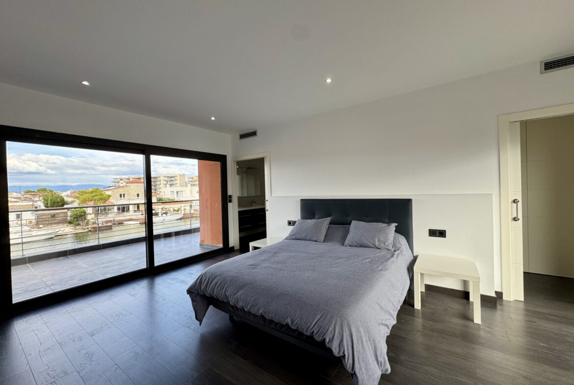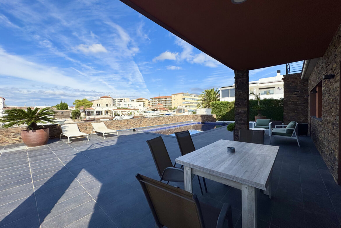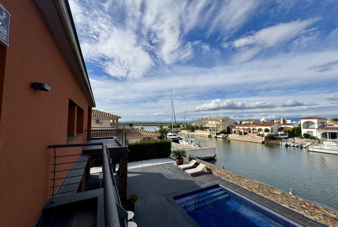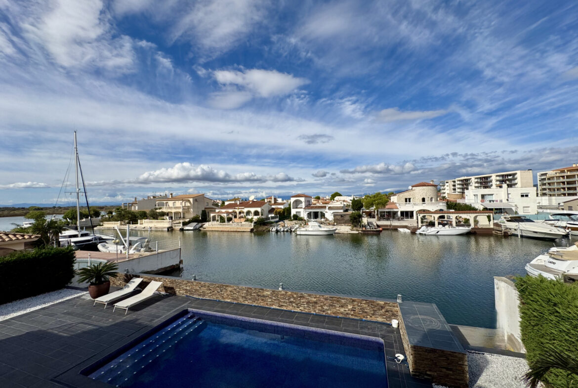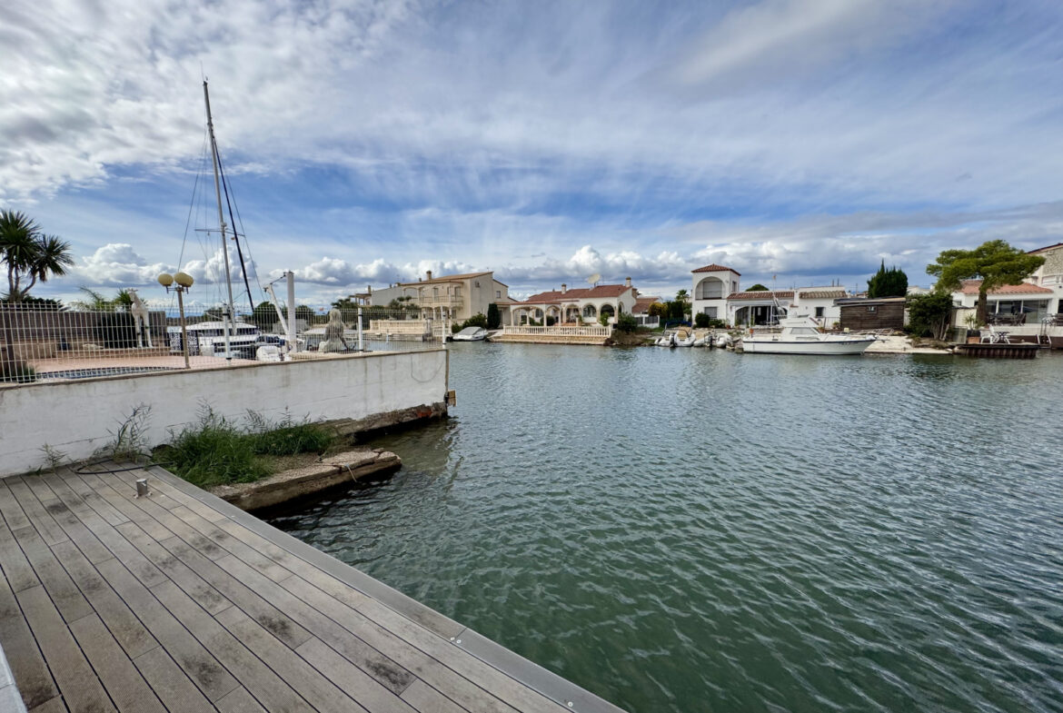 RV01 – Roses; Santa Margarida: Casa en el canal con 20 metros de amarre a la venta. Ideal para catamarán de grandes dimensiones.En la marina residencial de Santa Margarida, en Roses, se encuentra esta bonita casa de nueva construcción.Esta propiedad dispone de un amarre privado para que pueda disfrutar de su yate o velero. Puede acoger embarcaciones de hasta 20 m, a motor o de vela. En la gran terraza disfrutará de las bonitas vistas al canal, la montaña y el parque natural de los Aiguamolls. La vista de la puesta de sol le encantará. Para disfrutar del verano, la casa dispone de una piscina de 10 m x 5 m.La casa consta de un amplio y luminoso comedor, con chimenea y acceso directo al jardín y la piscina, ambos con vistas al canal. La cocina moderna, totalmente equipada, ofrece vistas al canal y a los Pirineos, además de acceso a la terraza. El hall de entrada es majestuoso, con techos altos y una escalera de granito que conduce a la planta superior, donde se ubican las tres suites con baño y terraza privada con vistas.Esta vivienda está construida con materiales modernos y con especial atención a la eficiencia energética, con doble aislamiento: por el exterior y con lana de roca en el interior. Dispone de garaje cerrado y aparcamiento para cuatro vehículos.Casa ubicada a 15 minutos a pie de la playa y de los comercios de Santa Margarida.~