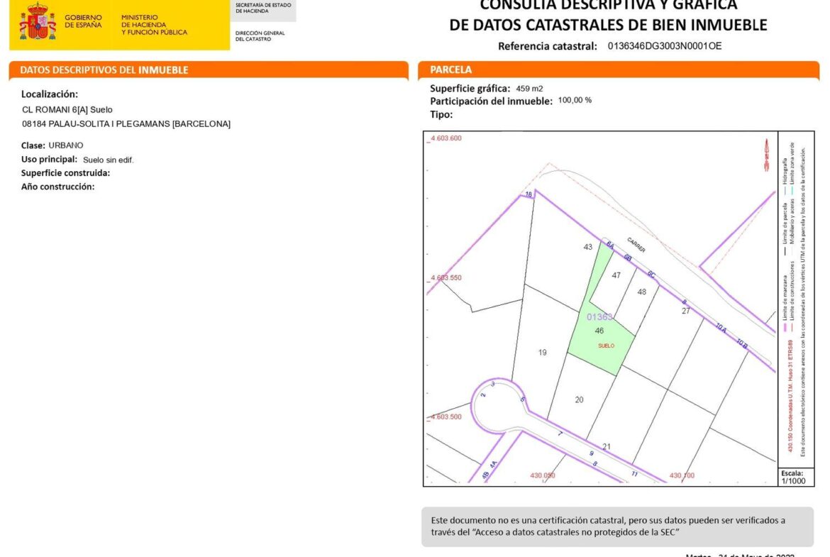 No dude en solicitar información acerca de este terreno de 459 metros cuadrados, ubicado en la urbanización can Riera, en la calle Romaní. La calle en la que se encuentra es calle sin salida, por lo que es muy tranquila y además que disfruta de magníficas vistas dado que al otro lado de la calle no existen edificaciones.La parcela es urbana, con una superficie edificable del 75% y permite edificar PB + 2 plantas piso. La ocupación máxima es del 40%.La calle dispone de alcantarillado y alumbrado público. Se accede a la parcela a través de un paso de uso privado desde la calle, tal y como se observa en el plano de catastro. Palau-Solità i Plegamans es un municipio de la comarca del Vallès Occidental. Fácil acceso a autopista, autovía y carretera y a 15 minutos de la ciudad de Barcelona y a 30 minutos del aeropuerto. La población dispone de todo tipo de servicios de un casco urbano consolidado, colegios, institutos, polideportivo, CAP, comercios, restaurantes.. . El hospital mas cercano se encuentra en la población de Mollet del Vallés.Gastos, impuestos y tributos inherentes a la compraventa no incluidos. El mobiliario y los conjuntos personales que figuran en las imágenes no son objeto de la oferta actual.~