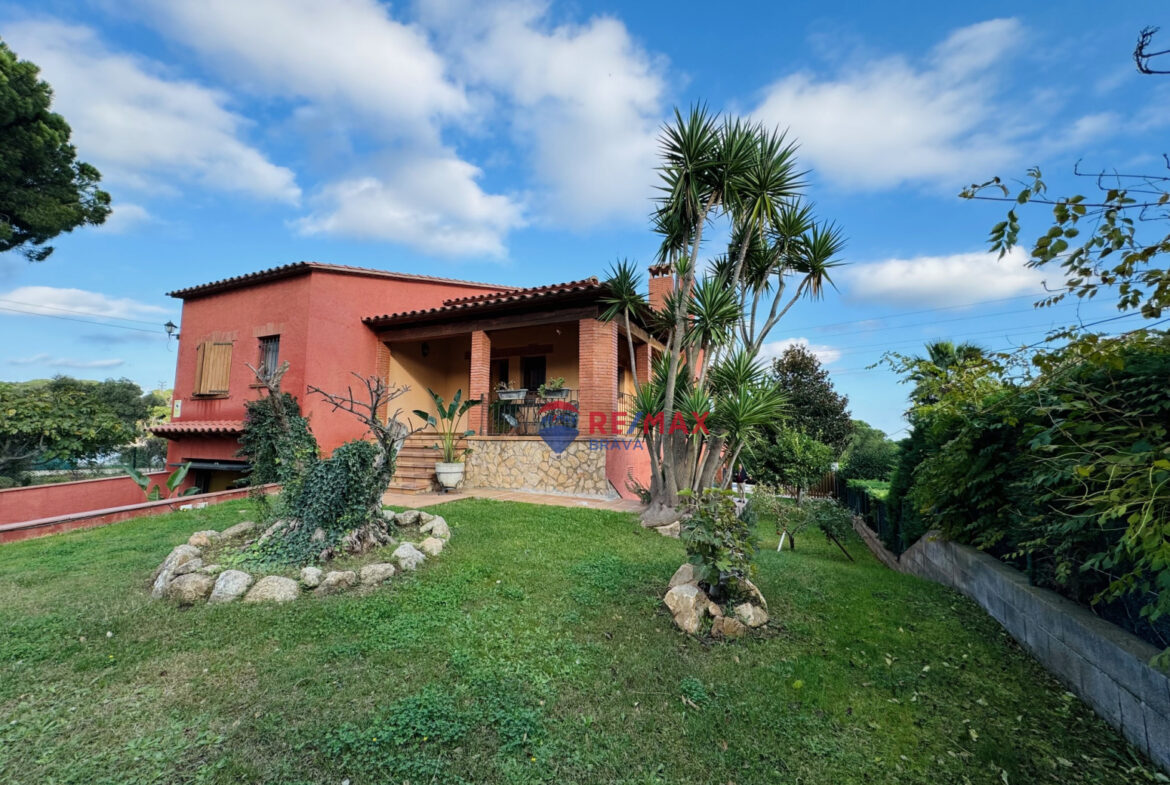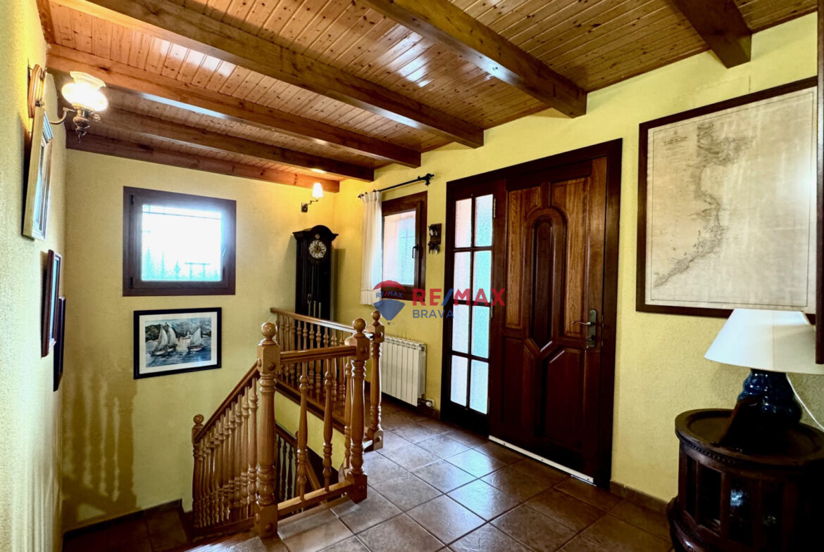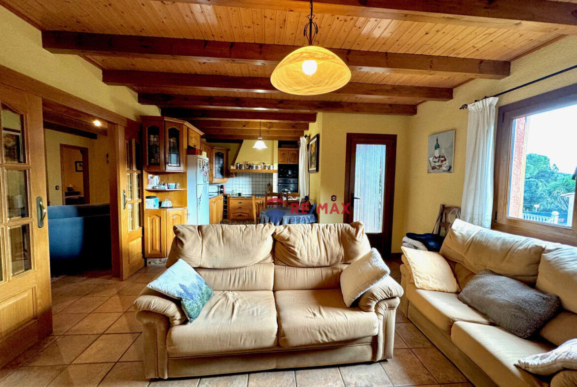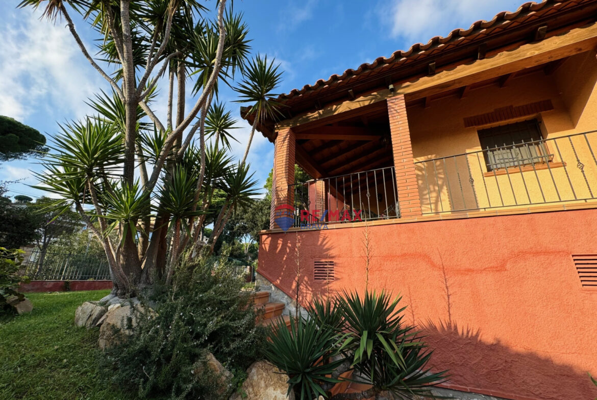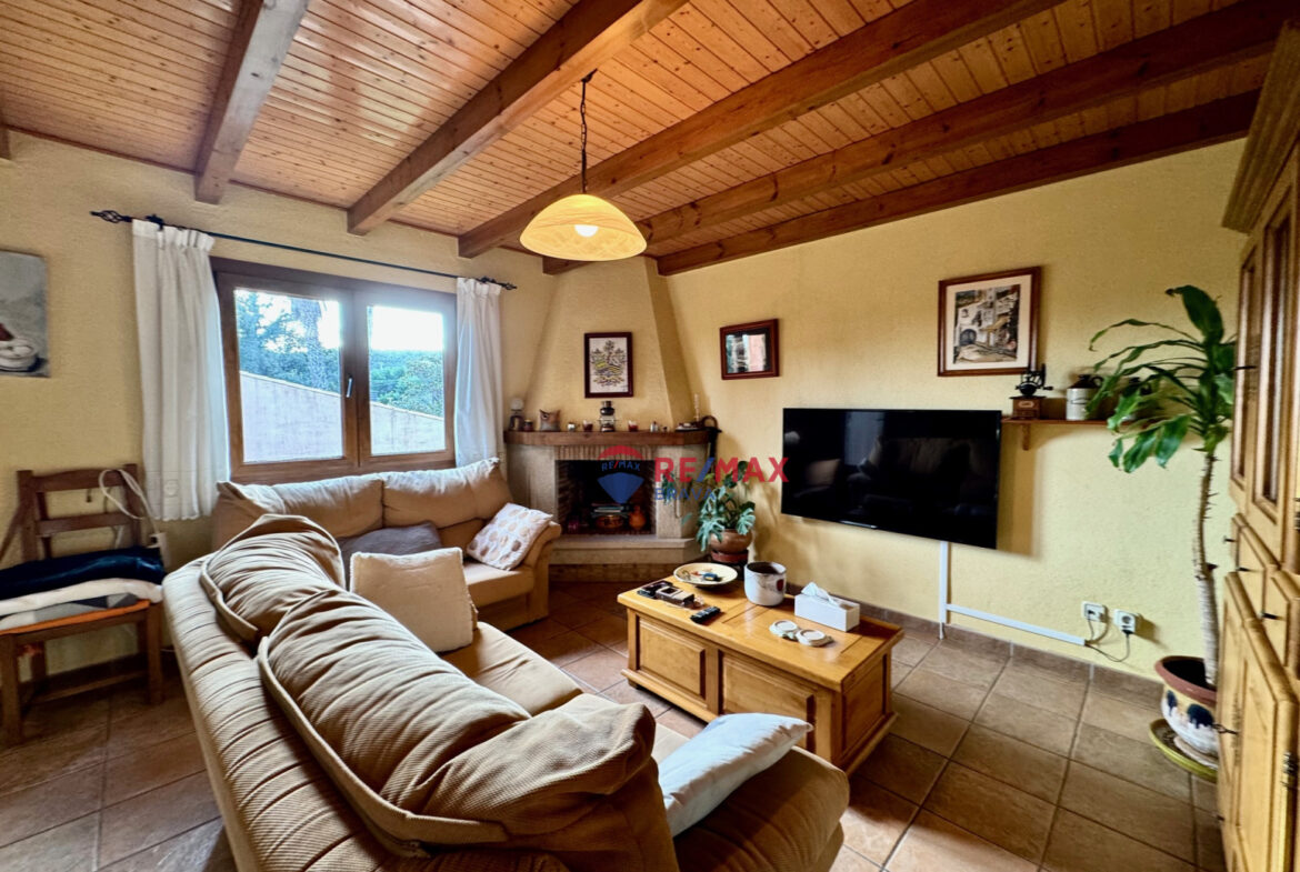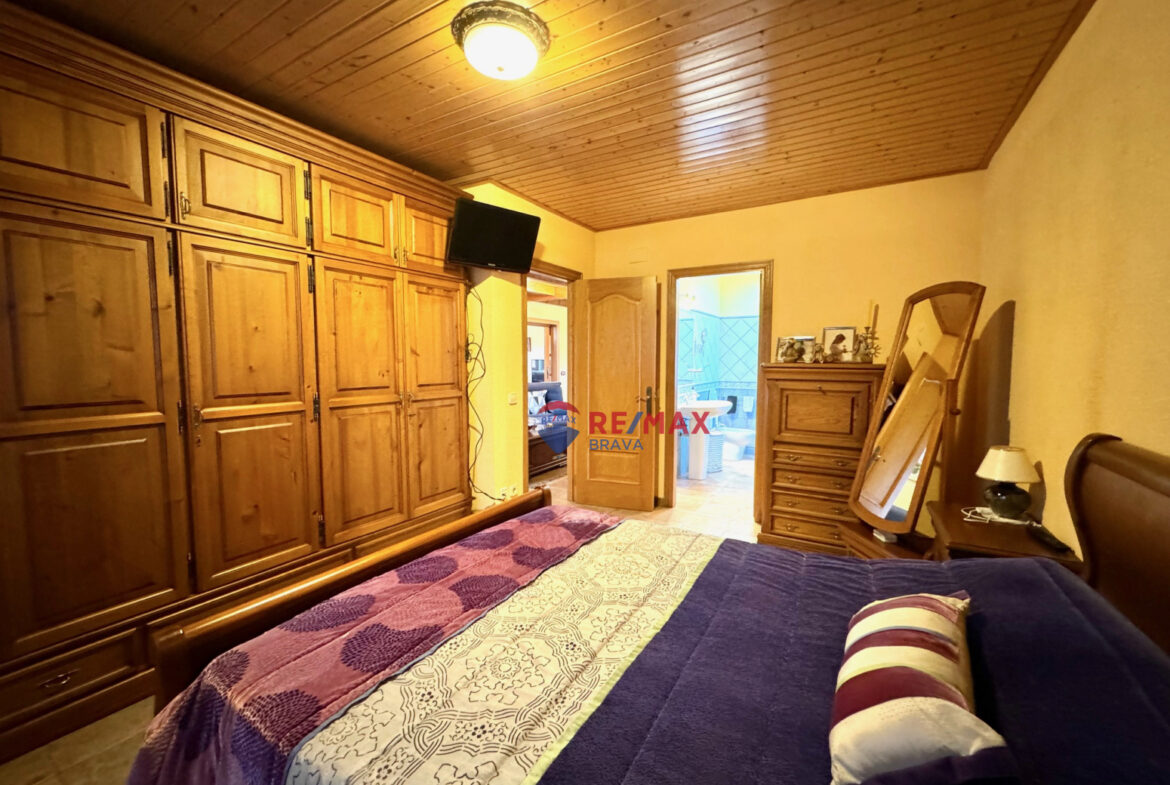 CALV06 Calonge: Casa. Magnífica villa con encanto y acabados de primera calidad! Construida en 2002, esta propiedad ofrece una amplia entrada, salón con elegante techo de madera, comedor con chimenea y cocina equipada. Cuenta con una suite principal, dos habitaciones dobles y un baño completo. Gran terraza cubierta para disfrutar del exterior. En el sótano, taller de 30 m² con aire acondicionado, cocina de verano y garaje para tres coches. Caseta de barbacoa, piscina de 8×4 m, jardín con frutales y pozo propio completan este oasis único. ¡Una oportunidad excepcional.~