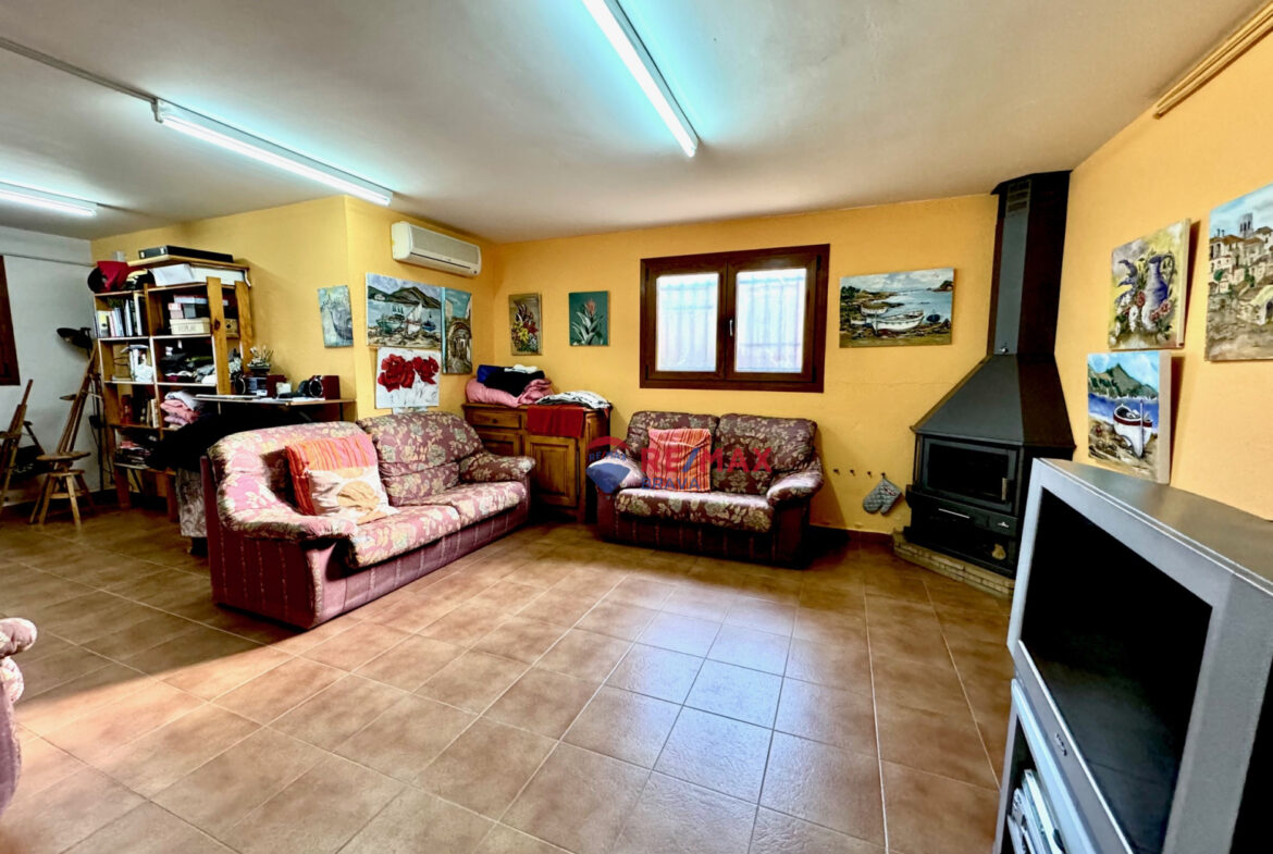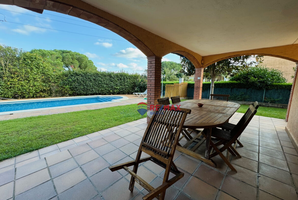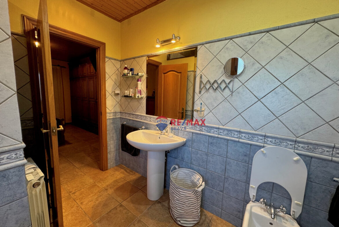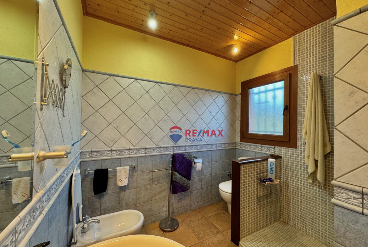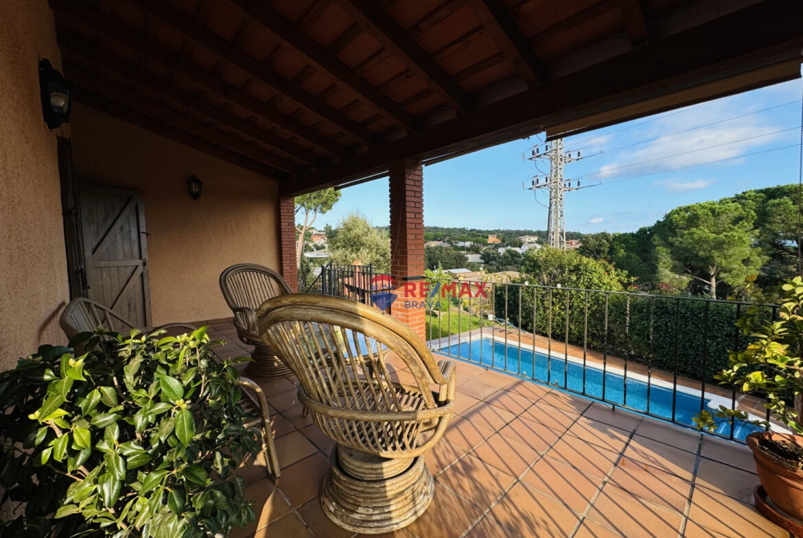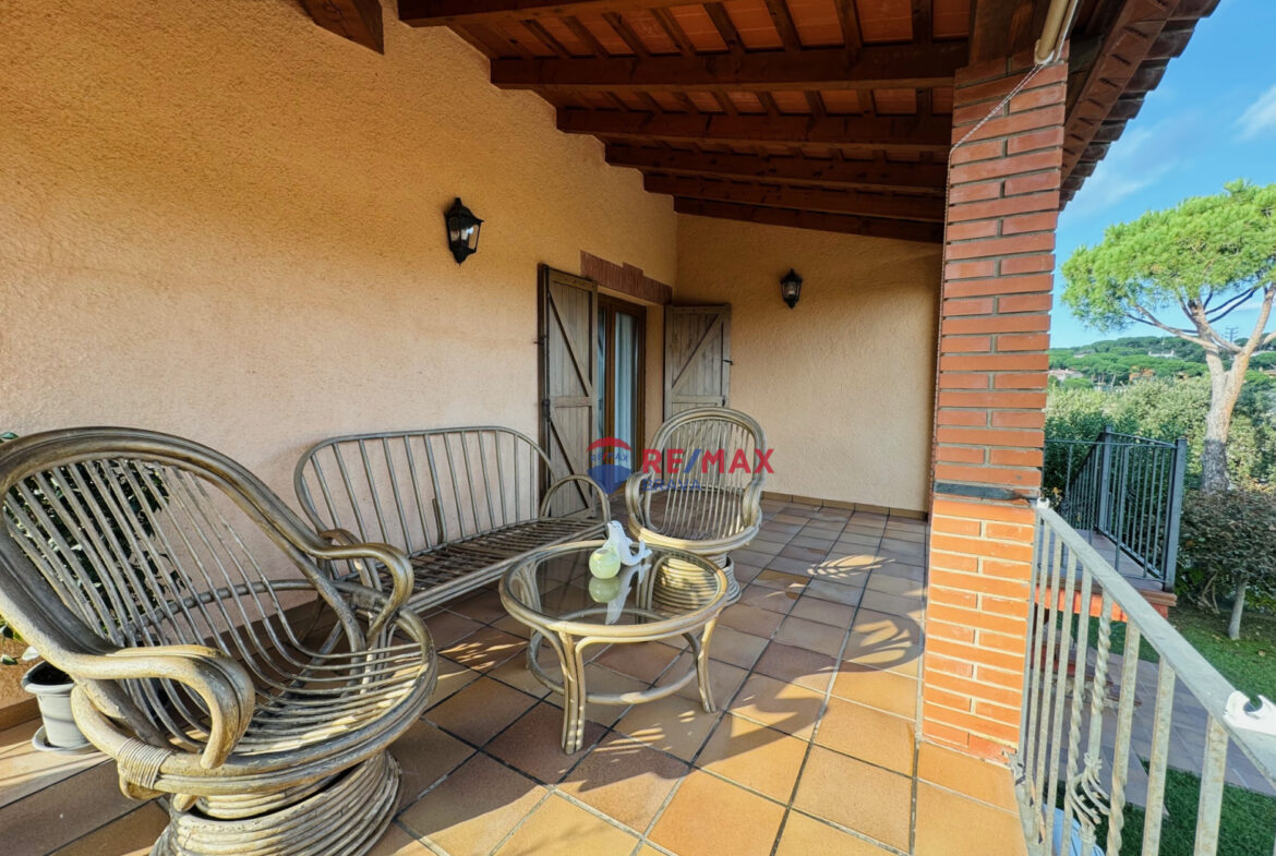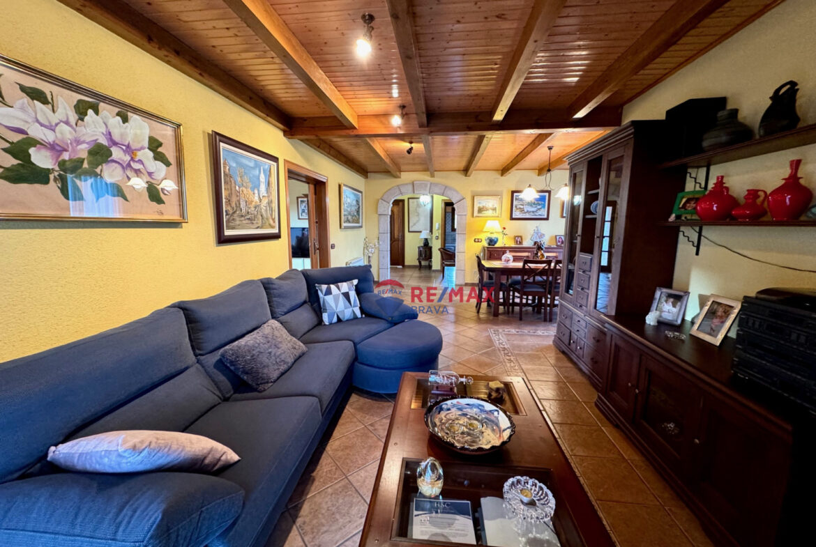 CALV06 Calonge: Casa. Magnífica villa con encanto y acabados de primera calidad! Construida en 2002, esta propiedad ofrece una amplia entrada, salón con elegante techo de madera, comedor con chimenea y cocina equipada. Cuenta con una suite principal, dos habitaciones dobles y un baño completo. Gran terraza cubierta para disfrutar del exterior. En el sótano, taller de 30 m² con aire acondicionado, cocina de verano y garaje para tres coches. Caseta de barbacoa, piscina de 8×4 m, jardín con frutales y pozo propio completan este oasis único. ¡Una oportunidad excepcional.~