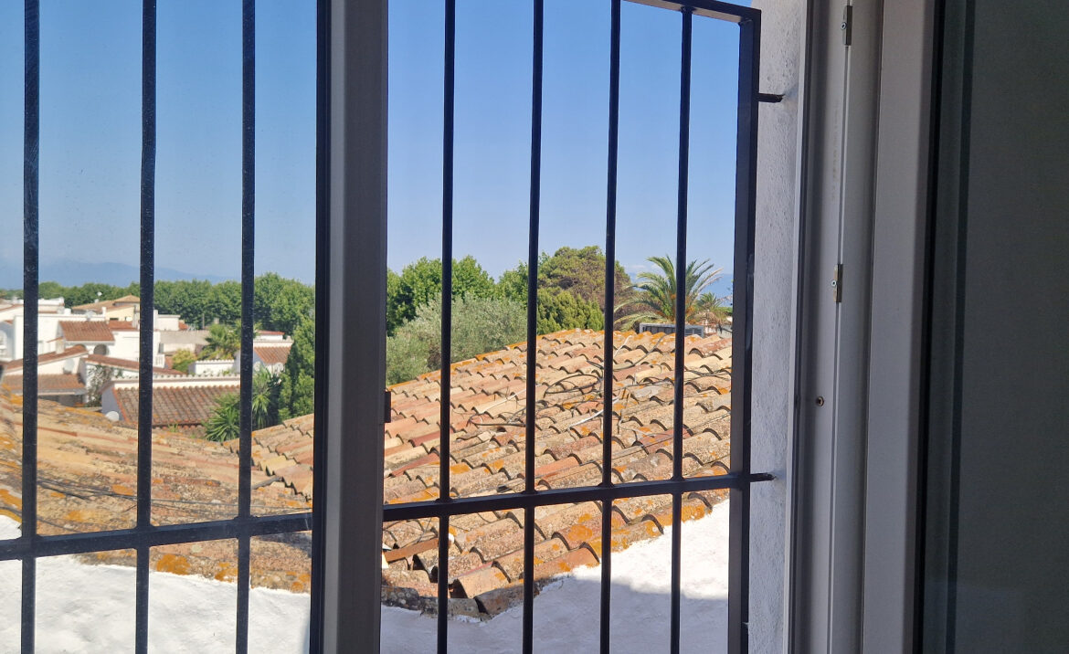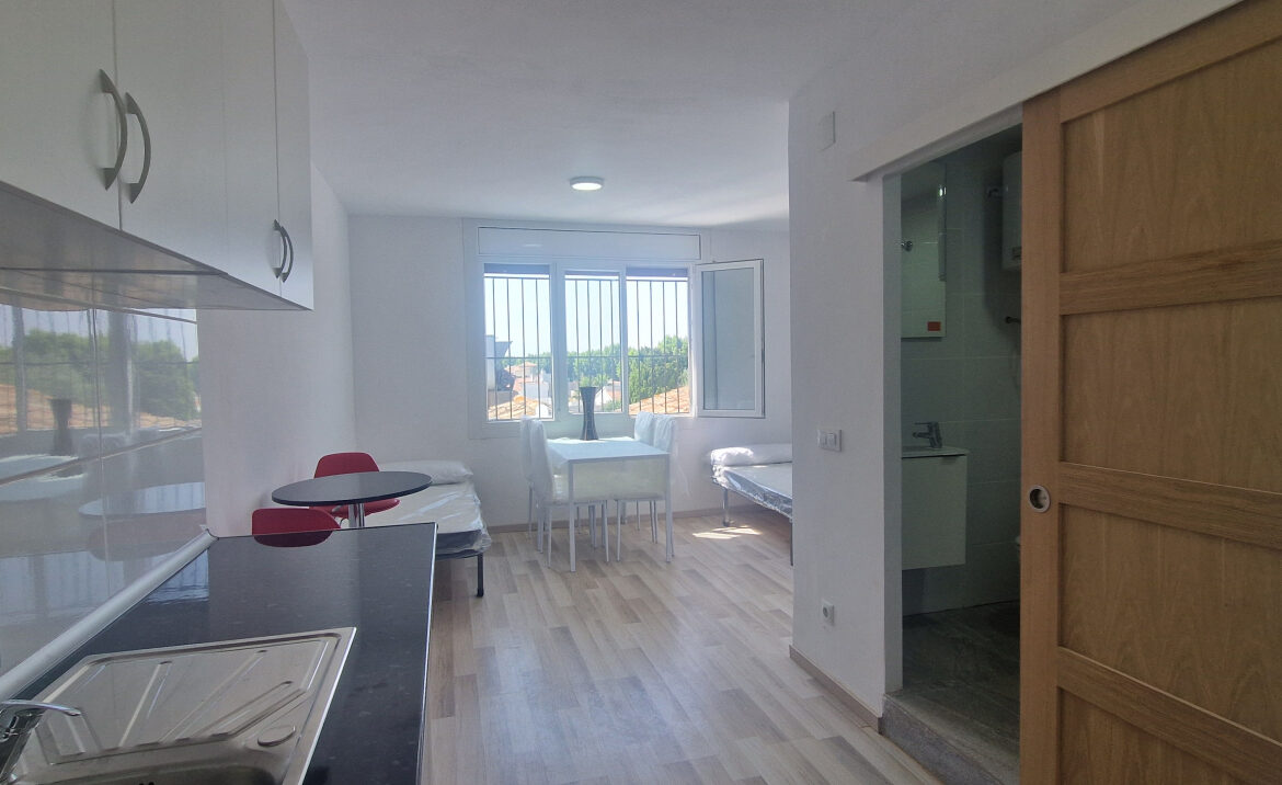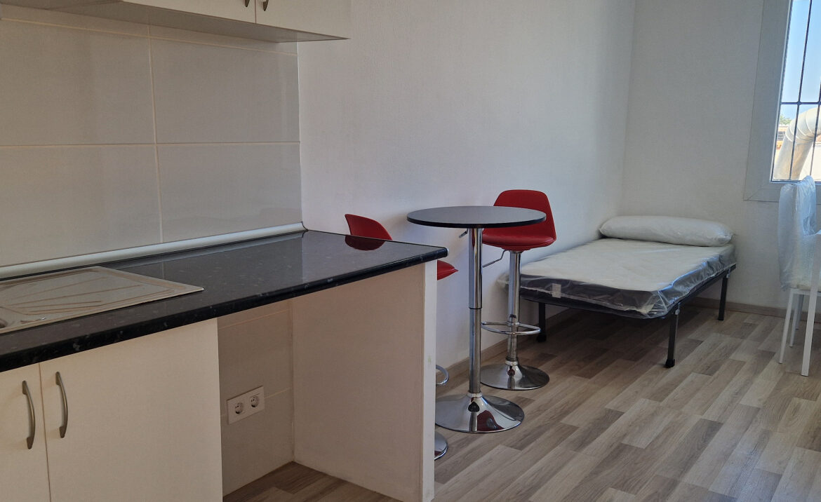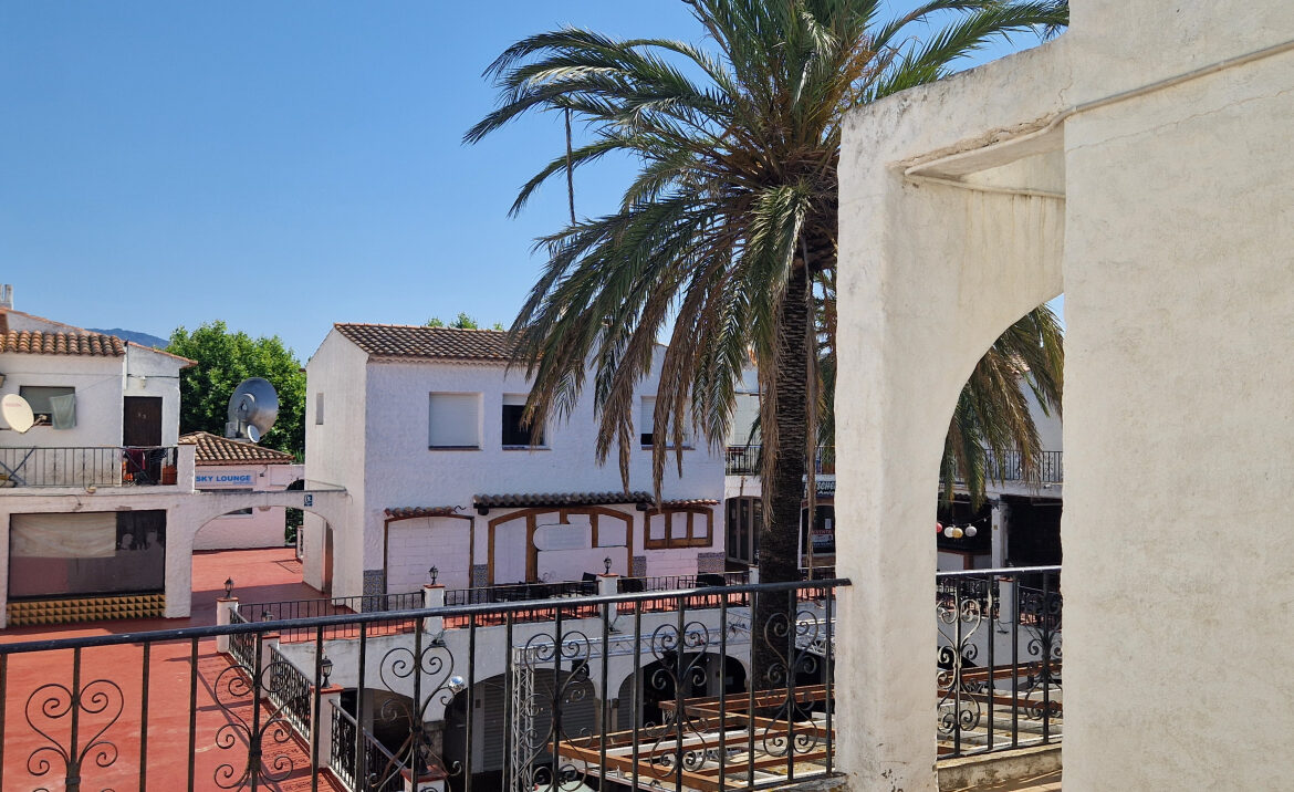 EA46 Empuriabrava, estudio en pleno centro. Este encantador estudio de 21,33 m2, ubicado en la segunda planta del edificio «Los Arcos», ha sido completamente renovado con esmero y buen gusto, en pleno corazón de Empuriabrava. El espacio cuenta con una cocina totalmente equipada, ideal para preparar tus comidas, y dispone de una mesa que acomoda a cuatro personas. A continuación, encontrarás dos cómodas camas individuales y un baño con ducha. Además, el estudio está equipado con un sistema de bomba de frío/calor y una amplia ventana de aluminio con reja, que permite disfrutar de la luz natural. ~