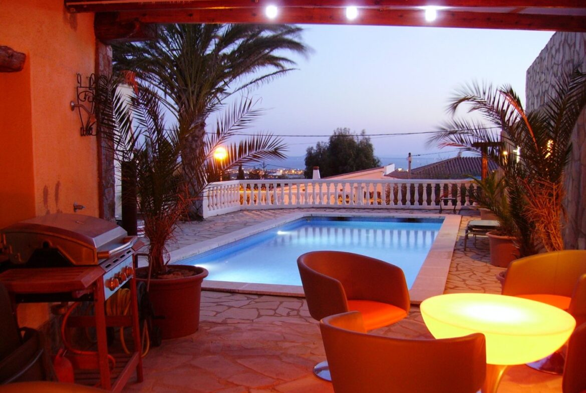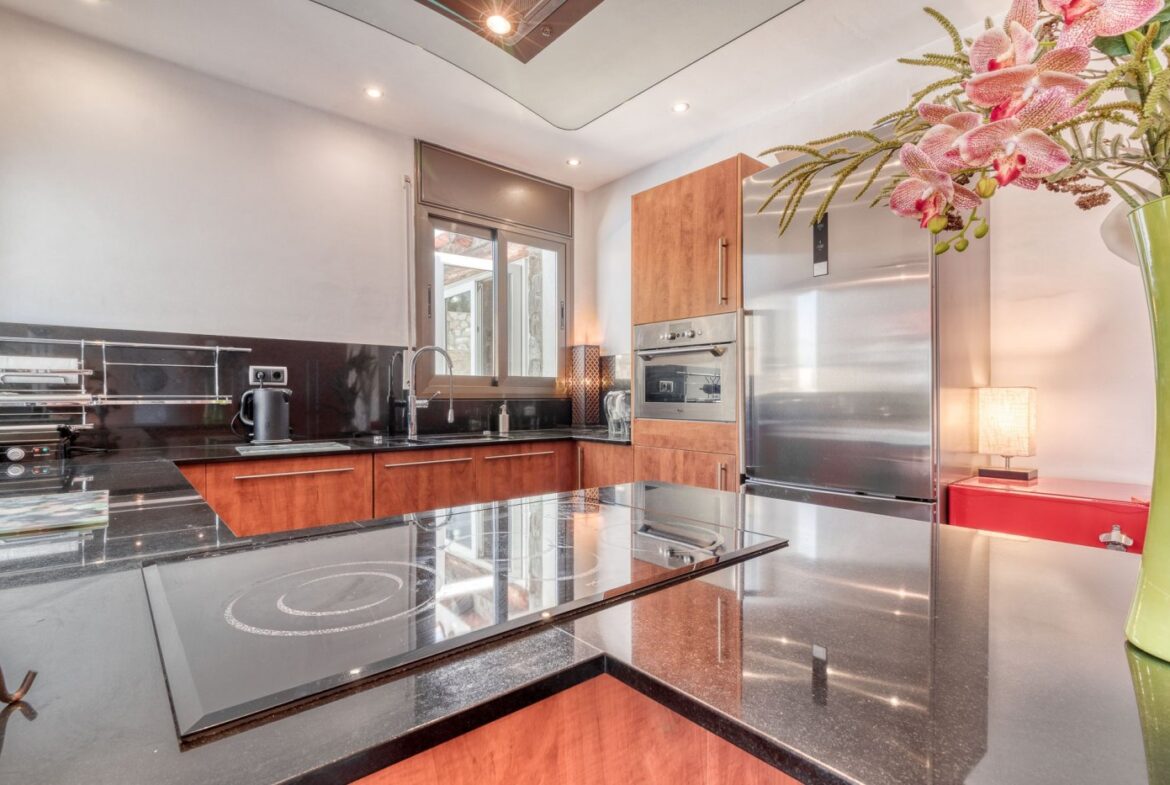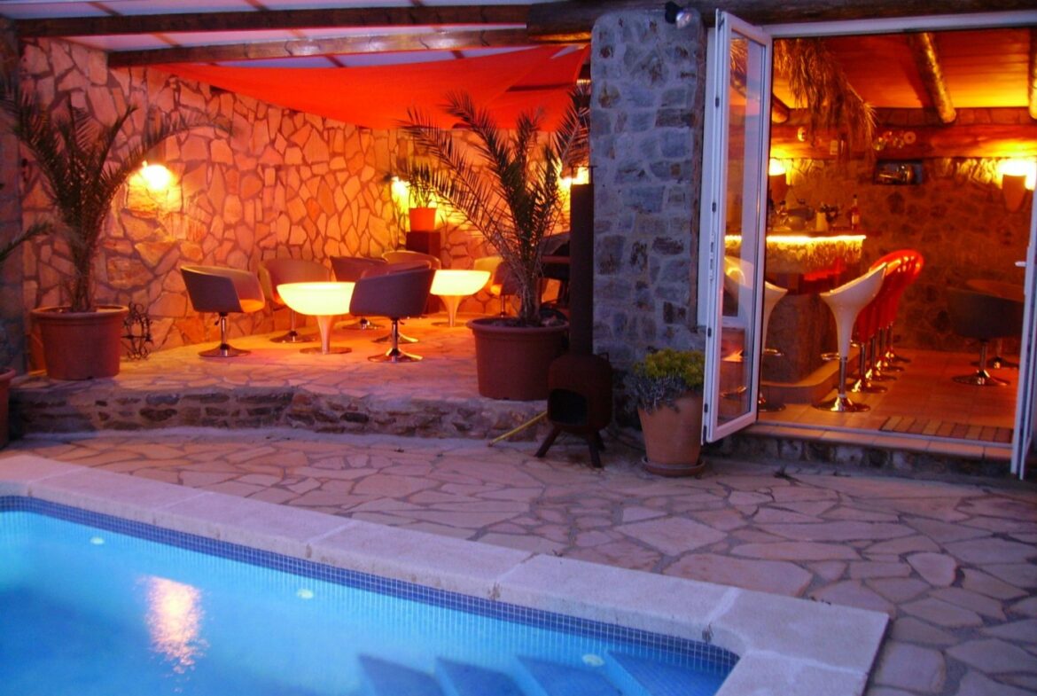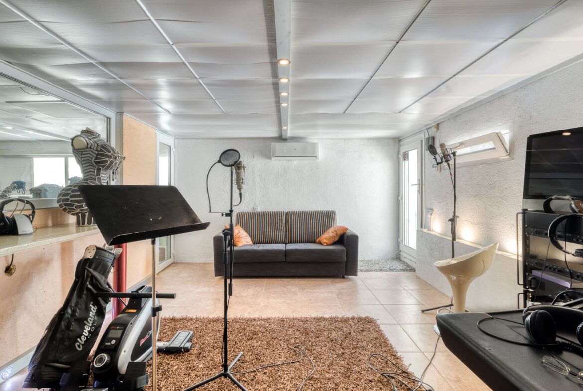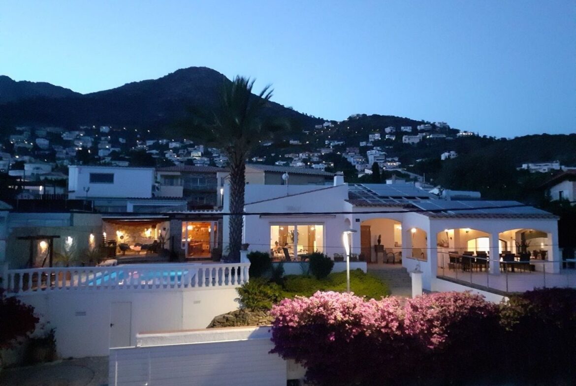Espectacular vivienda en la Urbanización Mas Fumats, en Roses. Dispone de 4 habitaciones, 3 baños, cocina americana completamente equipada, salón comedor con acceso directo a la terraza, piscina exterior de 9 x 4 metros, y barbacoa de gas. Desde la terraza podemos acceder a una zona de Bar/Pub, completamente equipado, con enfriador de vinos y sistema de enfriamiento de cerveza por barriles. Esta zona ocupa un lateral de la vivienda, completamente independiente, y dispone de sauna para 2 personas, un dormitorio y baño. También dispone de un porche destinado a chill-out.~ ~ El amplio porche de entrada tiene una zona destinada a comedor exterior para 10 personas con 2 ventiladores, perfecta para disfrutar en verano.~ ~ En la parte trasera se dispone de una zona de trabajo, exterior pero cubierta, con lavadora y congelador.~ ~ En la planta inferior se sitúa un estudio de grabación de música de 60 m2, totalmente equipado con altavoces activos, mesa de mezclas, Apple Imac con Logic e interfaz para grabación además de una ventana de separación entre la sala de control y la sala de grabación. Estas estancias podrían destinarse en un futuro a garaje y nueva habitación~ ~ En el techo hay un sistema de paneles solares fotovoltaicos para la generación de electricidad, un sistema solar para generación de agua caliente sanitaria y un sistema solar separado para calefacción por radiadores, que disminuyen considerablemente tanto el gasto eléctrico y de calefacción.~ La casa también está equipada con calefacción de gas (canalizado) y estufa de pellet.~ Todas las estancias están equipadas con Aire acondicionado~ ~ La urbanización “Mas Fumats” se encuentra localizada en un lugar de fácil acceso, a tres kilómetros de Roses y de sus playas. Es una zona tranquila y residencial, que se desarrolló en los años 70.~ ~ Desde la Urbanización se puede disfrutar de vistas espectaculares sobre la bahía de Roses. El tamaño promedio de las parcelas es de entre 400 y 600 metros cuadrados. La zona comercial y de restauración se sitúan a dos minutos en coche.~ ~ ~