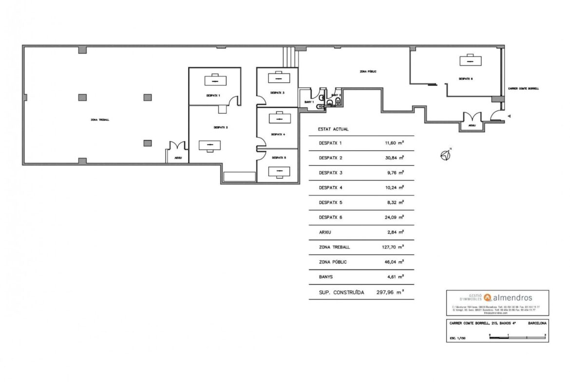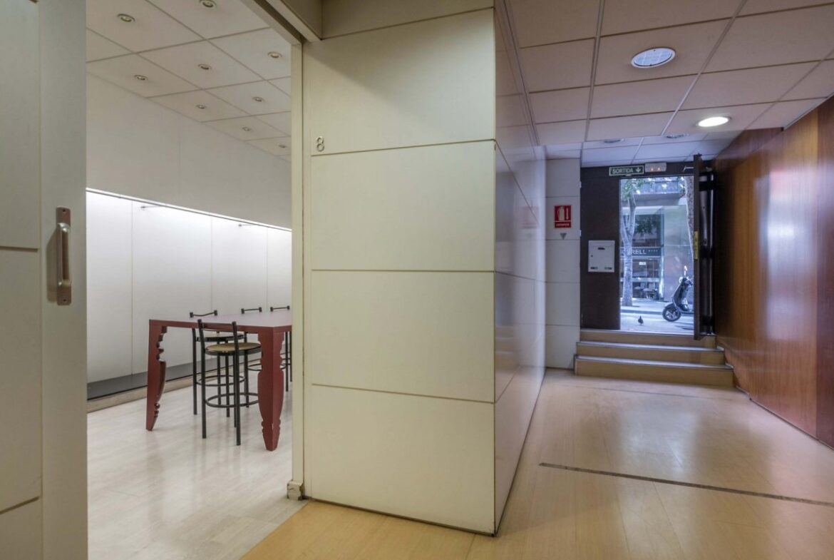 Ubicado en la céntrica calle Comte Borrell, este amplio local comercial se encuentra en una zona con alto tránsito peatonal, rodeado de servicios, comercios y con excelentes conexiones de transporte público (metro L1 y L5, y varias líneas de autobús).~~Actualmente distribuido en recepción, seis despachos, sala de archivo y una gran sala diáfana de 100 m². Espacio totalmente adaptable, con posibilidad de dejar toda la superficie abierta.~~300 m² construidos~~Techo técnico~~Climatización frío/calor por splits~~Preinstalación de red~~Puerta blindada~~Dos aseos~~En perfecto estado de conservación~~Ideal para oficinas, centros médicos, academias, coworking u otros negocios. También muy atractivo como inversión gracias a su potencial de rentabilidad.~~Una gran oportunidad en una de las mejores zonas de Barcelona.~