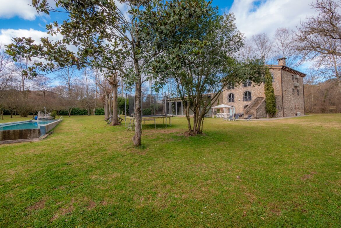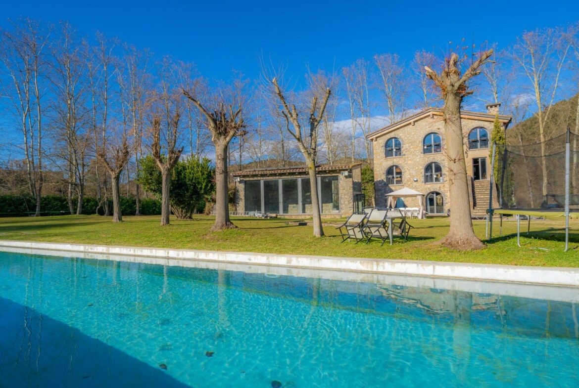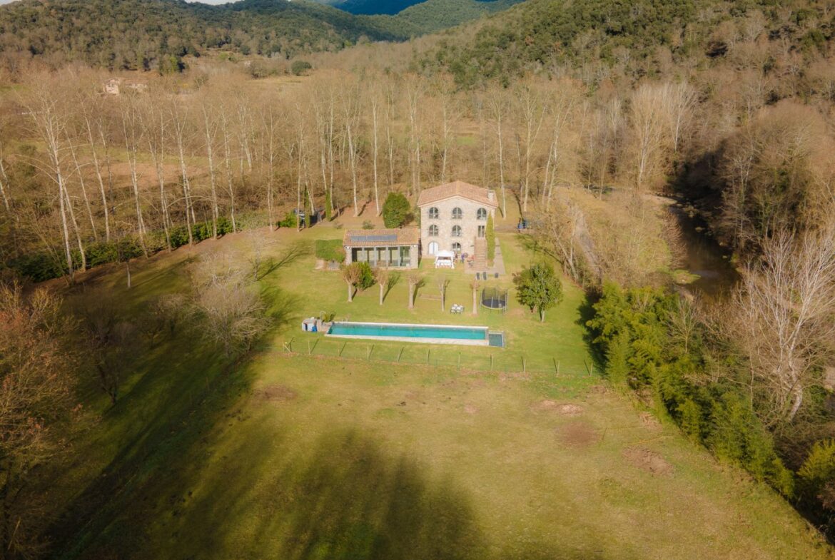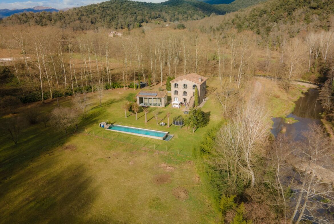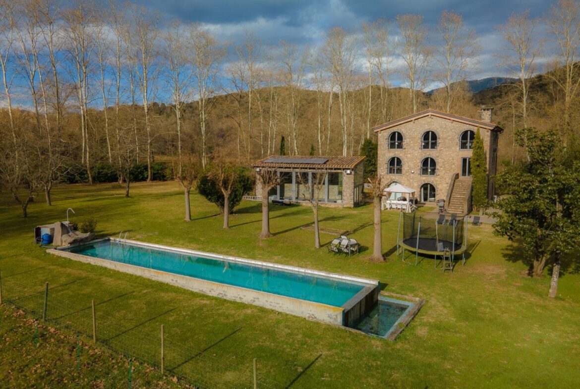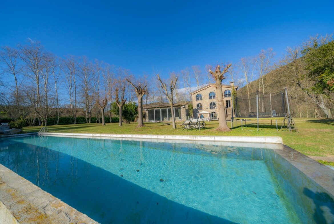 En exclusiva, una masía de arquitectura tradicional catalana totalmente restaurada con muy buen gusto, en la comarca de La Garrotxa, exactamente en Sant Joan Les Fonts y a diez minutos de la ciudad de Olot, con un terreno de casi tres hectáreas.~~La masía dispone de aproximadamente 140 m² cada planta y se distribuye de la siguiente manera:~~En la Planta baja una sala diáfana con varias puertas acristaladas de entrada y salida al exterior de la casa y al jardín, compuesta de salón-comedor con cocina americana, chimenea y baño de cortesía. ~~~En la primera planta encontramos dos suites con sus respectivos baños completos con ducha: Una de aproximadamente 75 m² y la otra de 40 m². La más grande con acceso directo al jardín y piscina.~~En la segunda y última planta, la gran suite de unos 140 m² con baño completo acristalad.~~La propiedad dispone de una piscina interior con agua caliente y otra exterior.~~Es una masía de piedra de un diseño exquisito, moderna y acogedora, en un entorno que no deja indiferente. Una mezcla de paz, comodidad y con los servicios necesarios muy cerca de la ubicación de la propiedad.~Situada en un lugar privilegiado, un territorio con gran valor y gran belleza natural. Muy cerca del parque Natural de la Zona Volcánica de la Garrotxa.~~Dispone de suelo radiante, splits en todas las salas y habitaciones; wifi; piscina interior de agua caliente con placas solares y otra piscina exterior.~~El agua para la piscina y para el riego de todo el terreno proviene de la Font Del Serrat.~~~~~~~~~