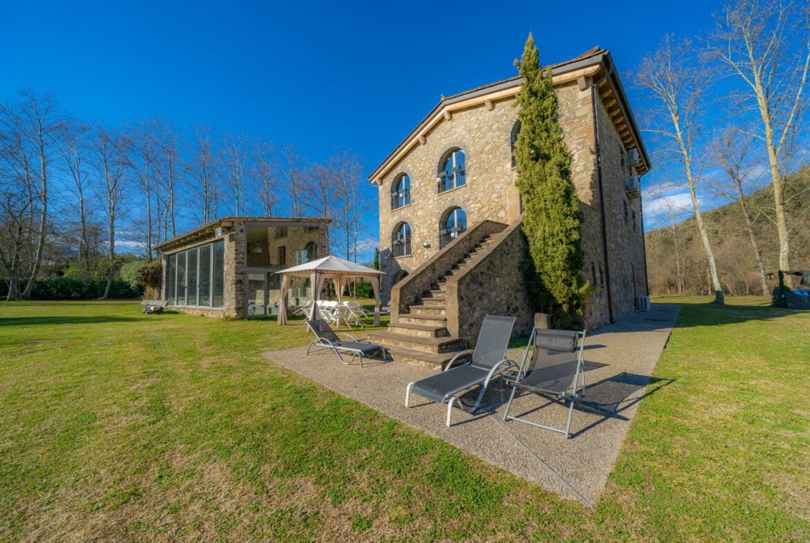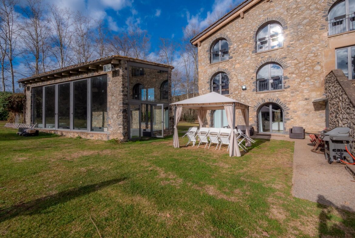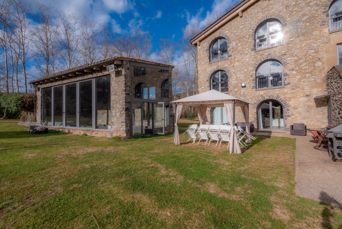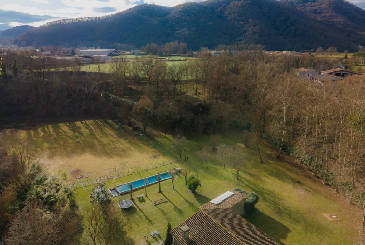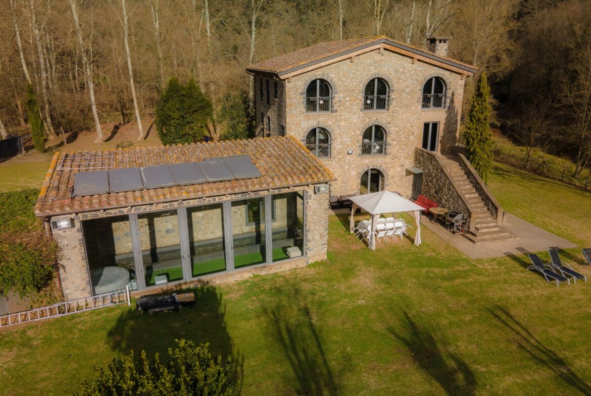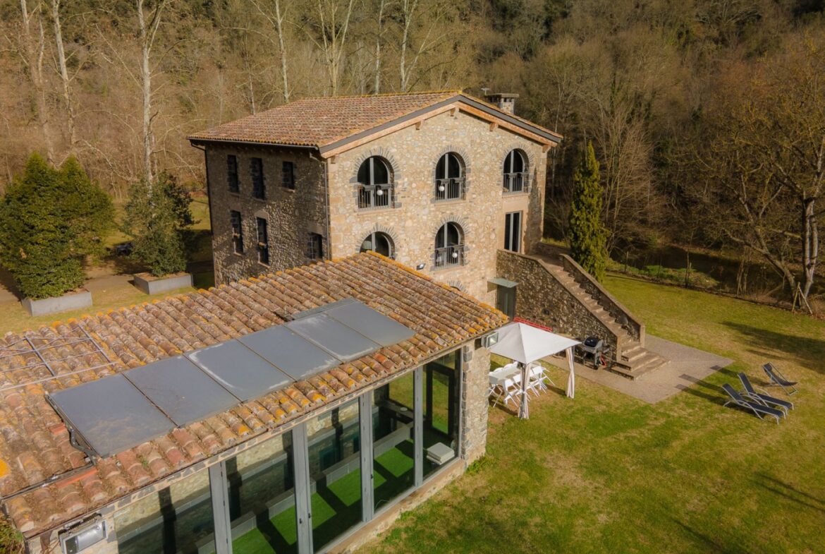 En exclusiva, una masía de arquitectura tradicional catalana totalmente restaurada con muy buen gusto, en la comarca de La Garrotxa, exactamente en Sant Joan Les Fonts y a diez minutos de la ciudad de Olot, con un terreno de casi tres hectáreas.~~La masía dispone de aproximadamente 140 m² cada planta y se distribuye de la siguiente manera:~~En la Planta baja una sala diáfana con varias puertas acristaladas de entrada y salida al exterior de la casa y al jardín, compuesta de salón-comedor con cocina americana, chimenea y baño de cortesía. ~~~En la primera planta encontramos dos suites con sus respectivos baños completos con ducha: Una de aproximadamente 75 m² y la otra de 40 m². La más grande con acceso directo al jardín y piscina.~~En la segunda y última planta, la gran suite de unos 140 m² con baño completo acristalad.~~La propiedad dispone de una piscina interior con agua caliente y otra exterior.~~Es una masía de piedra de un diseño exquisito, moderna y acogedora, en un entorno que no deja indiferente. Una mezcla de paz, comodidad y con los servicios necesarios muy cerca de la ubicación de la propiedad.~Situada en un lugar privilegiado, un territorio con gran valor y gran belleza natural. Muy cerca del parque Natural de la Zona Volcánica de la Garrotxa.~~Dispone de suelo radiante, splits en todas las salas y habitaciones; wifi; piscina interior de agua caliente con placas solares y otra piscina exterior.~~El agua para la piscina y para el riego de todo el terreno proviene de la Font Del Serrat.~~~~~~~~~