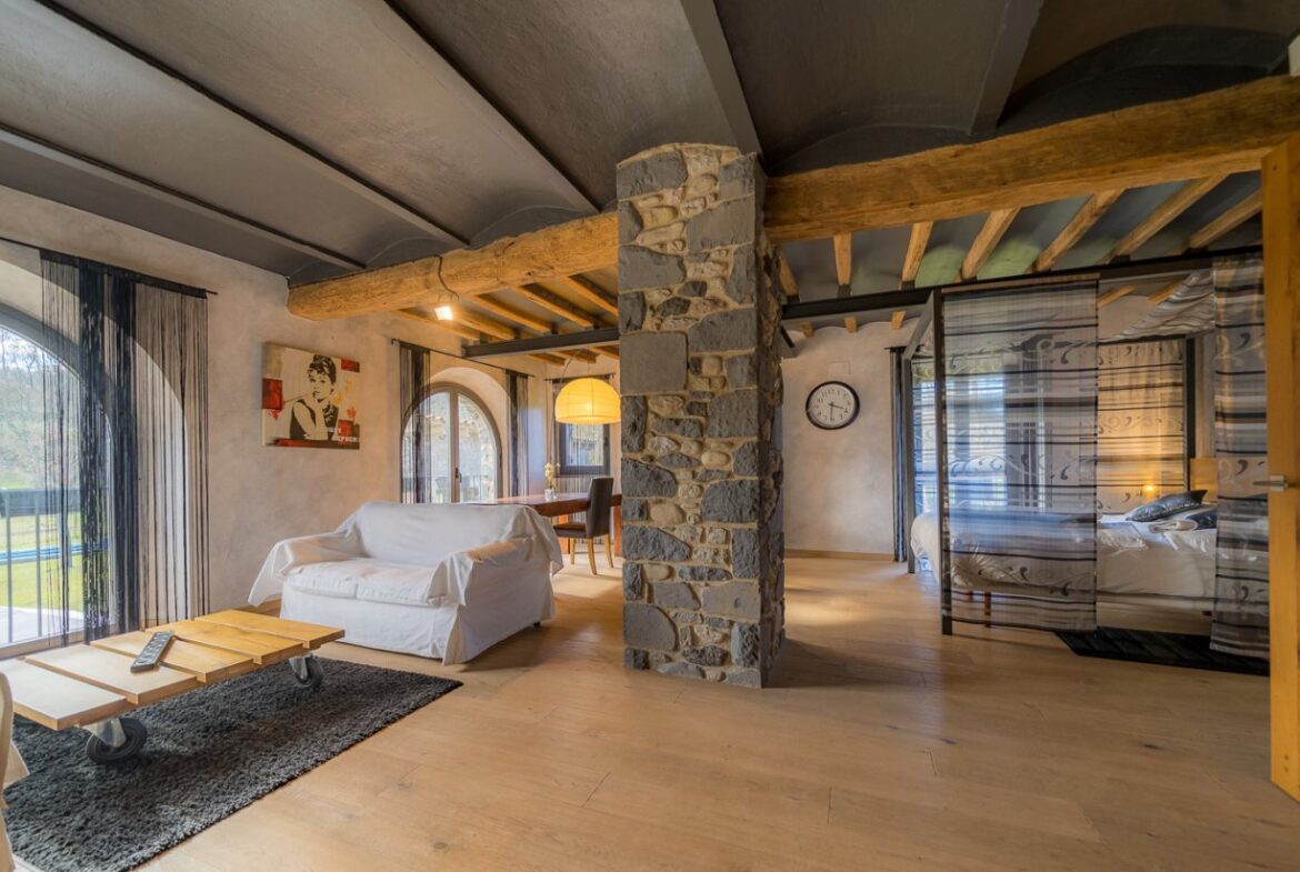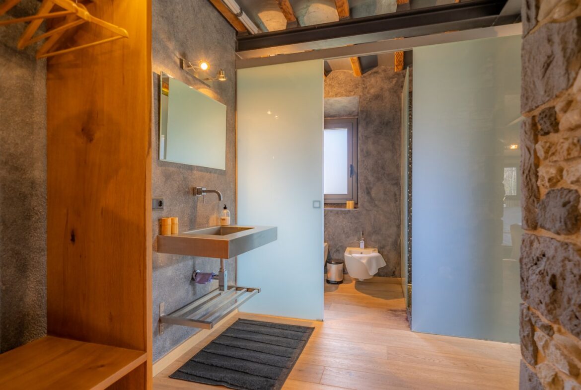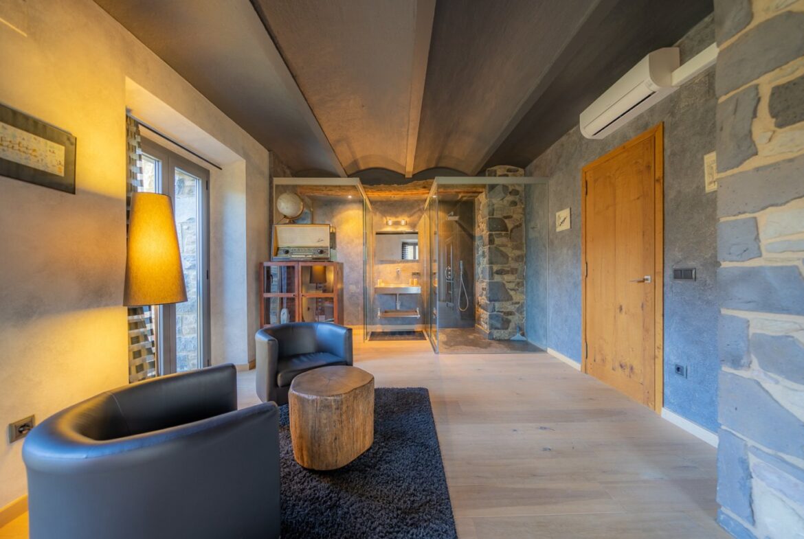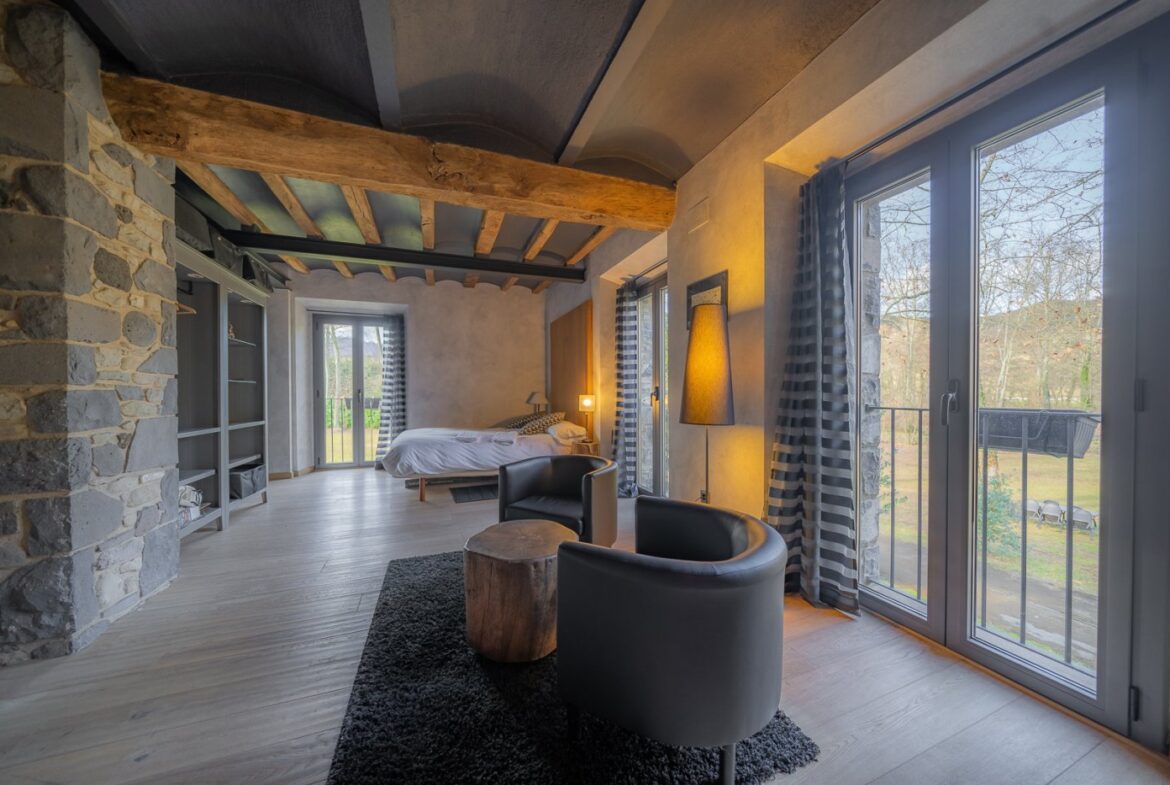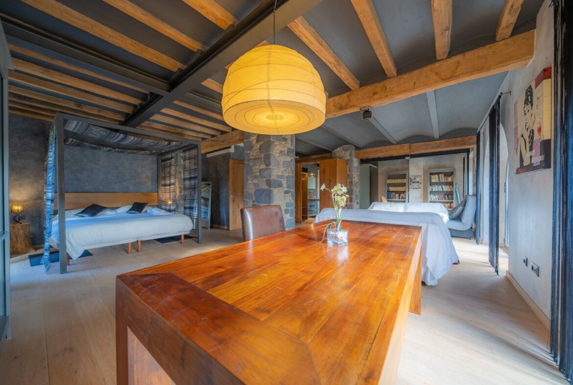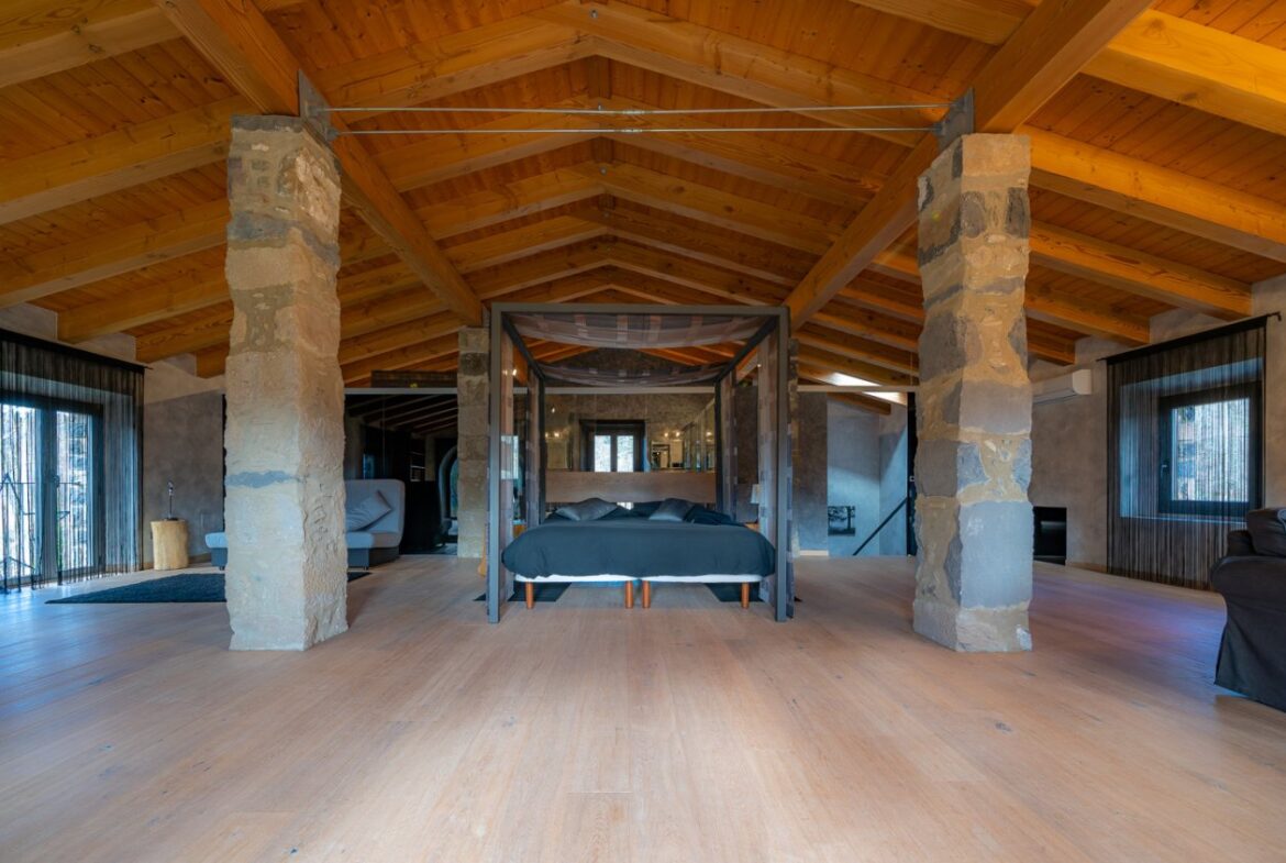 En exclusiva, una masía de arquitectura tradicional catalana totalmente restaurada con muy buen gusto, en la comarca de La Garrotxa, exactamente en Sant Joan Les Fonts y a diez minutos de la ciudad de Olot, con un terreno de casi tres hectáreas.~~La masía dispone de aproximadamente 140 m² cada planta y se distribuye de la siguiente manera:~~En la Planta baja una sala diáfana con varias puertas acristaladas de entrada y salida al exterior de la casa y al jardín, compuesta de salón-comedor con cocina americana, chimenea y baño de cortesía. ~~~En la primera planta encontramos dos suites con sus respectivos baños completos con ducha: Una de aproximadamente 75 m² y la otra de 40 m². La más grande con acceso directo al jardín y piscina.~~En la segunda y última planta, la gran suite de unos 140 m² con baño completo acristalad.~~La propiedad dispone de una piscina interior con agua caliente y otra exterior.~~Es una masía de piedra de un diseño exquisito, moderna y acogedora, en un entorno que no deja indiferente. Una mezcla de paz, comodidad y con los servicios necesarios muy cerca de la ubicación de la propiedad.~Situada en un lugar privilegiado, un territorio con gran valor y gran belleza natural. Muy cerca del parque Natural de la Zona Volcánica de la Garrotxa.~~Dispone de suelo radiante, splits en todas las salas y habitaciones; wifi; piscina interior de agua caliente con placas solares y otra piscina exterior.~~El agua para la piscina y para el riego de todo el terreno proviene de la Font Del Serrat.~~~~~~~~~