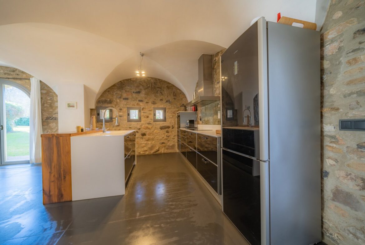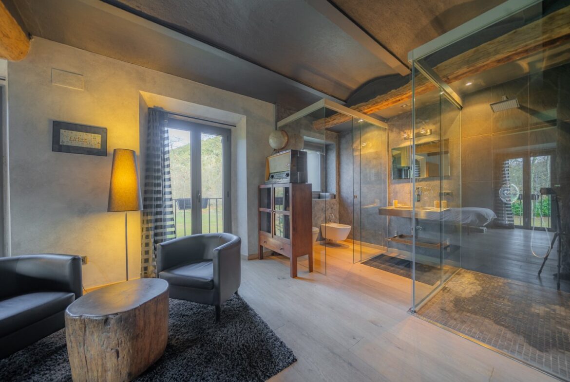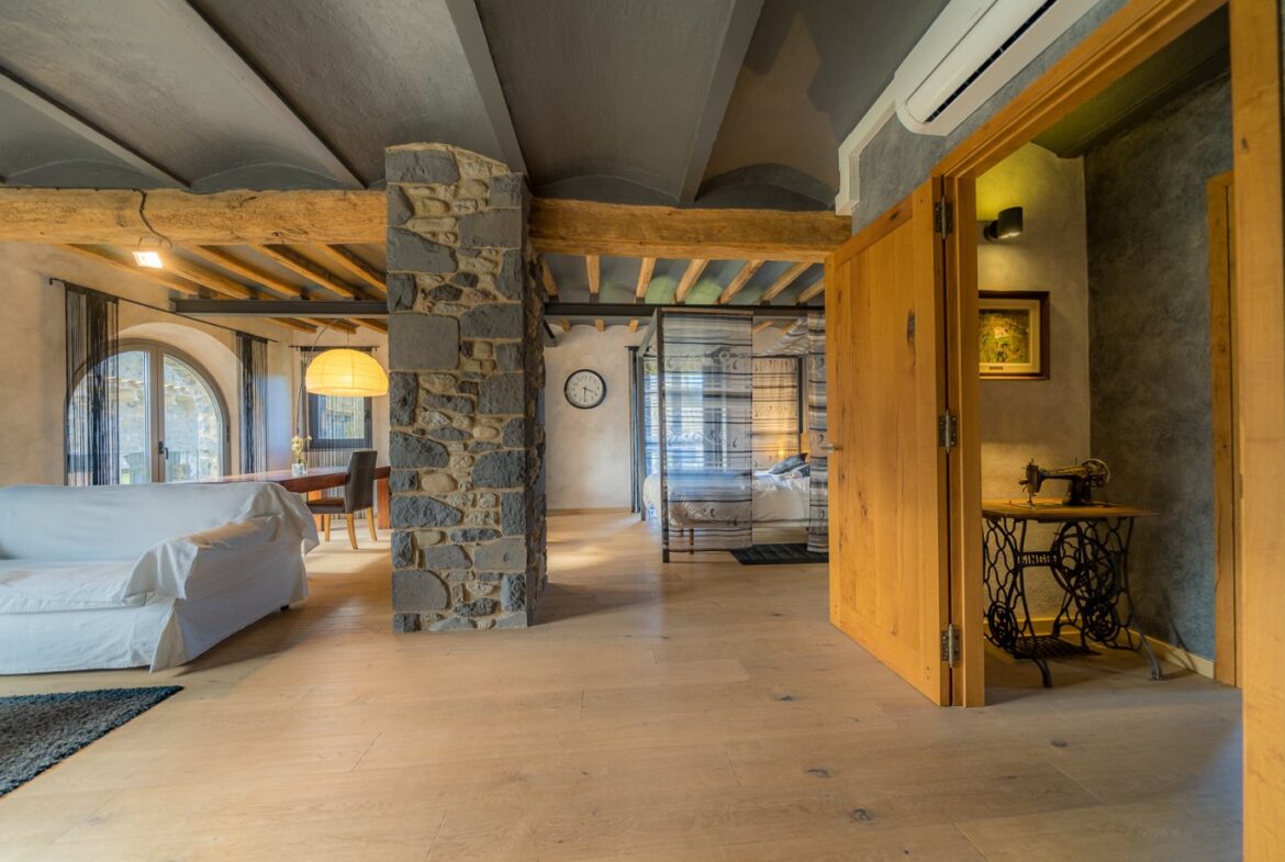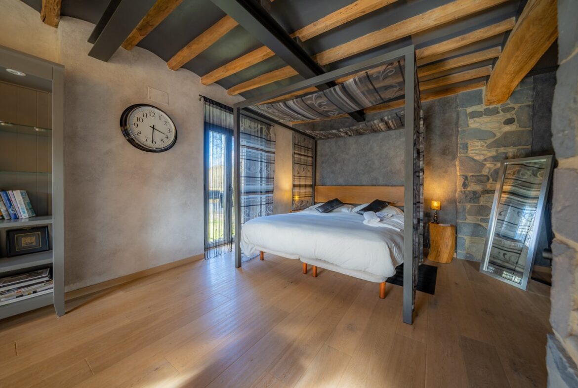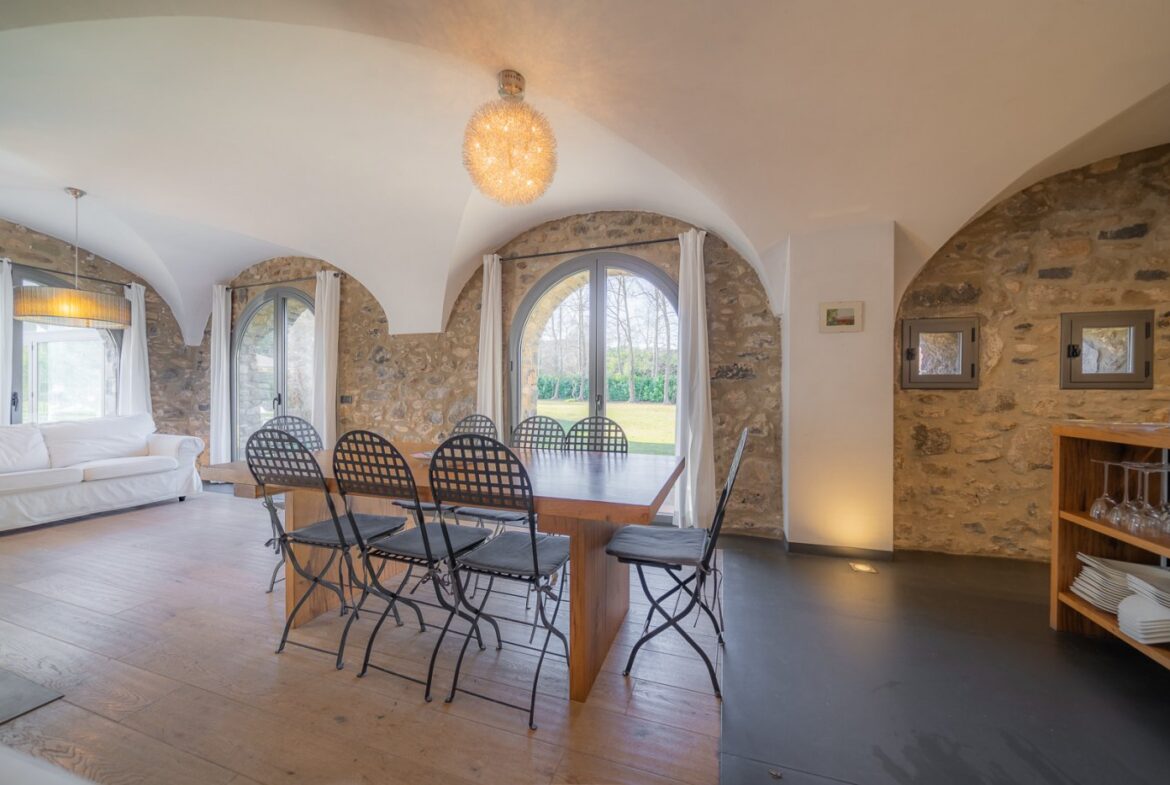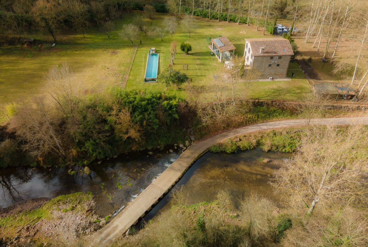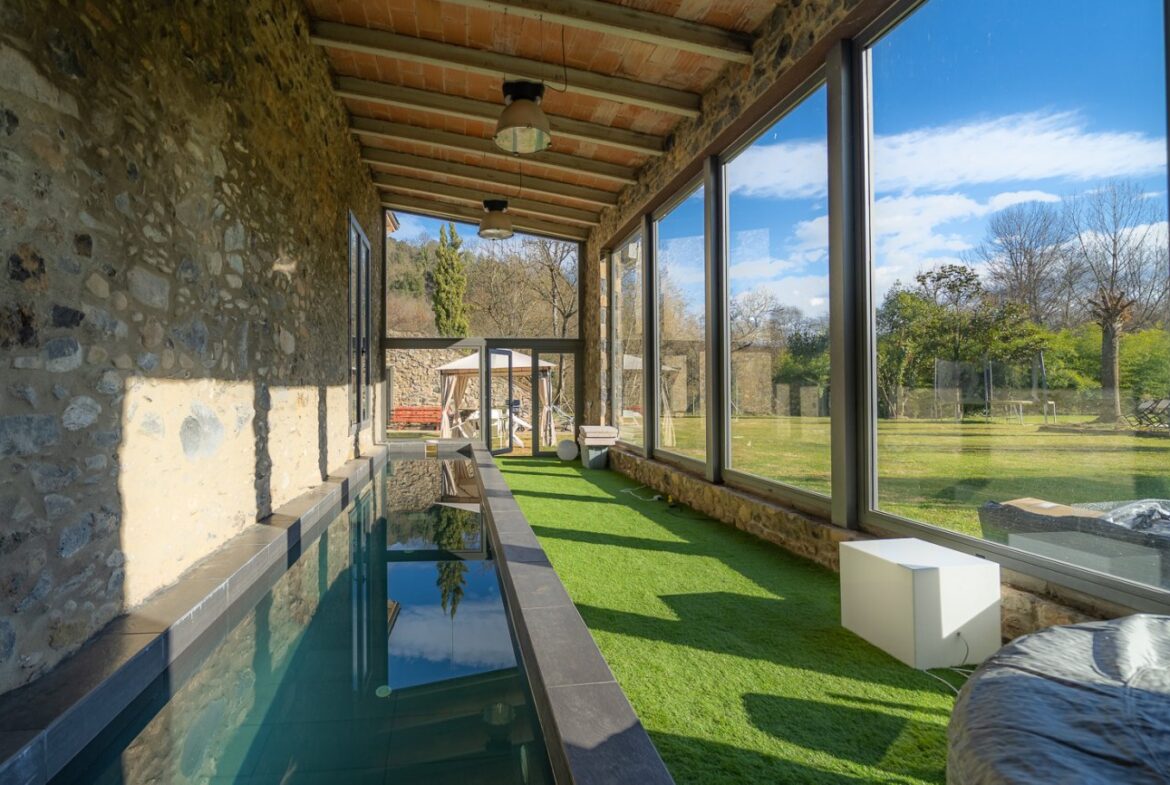 En exclusiva, una masía de arquitectura tradicional catalana totalmente restaurada con muy buen gusto, en la comarca de La Garrotxa, exactamente en Sant Joan Les Fonts y a diez minutos de la ciudad de Olot, con un terreno de casi tres hectáreas.~~La masía dispone de aproximadamente 140 m² cada planta y se distribuye de la siguiente manera:~~En la Planta baja una sala diáfana con varias puertas acristaladas de entrada y salida al exterior de la casa y al jardín, compuesta de salón-comedor con cocina americana, chimenea y baño de cortesía. ~~~En la primera planta encontramos dos suites con sus respectivos baños completos con ducha: Una de aproximadamente 75 m² y la otra de 40 m². La más grande con acceso directo al jardín y piscina.~~En la segunda y última planta, la gran suite de unos 140 m² con baño completo acristalad.~~La propiedad dispone de una piscina interior con agua caliente y otra exterior.~~Es una masía de piedra de un diseño exquisito, moderna y acogedora, en un entorno que no deja indiferente. Una mezcla de paz, comodidad y con los servicios necesarios muy cerca de la ubicación de la propiedad.~Situada en un lugar privilegiado, un territorio con gran valor y gran belleza natural. Muy cerca del parque Natural de la Zona Volcánica de la Garrotxa.~~Dispone de suelo radiante, splits en todas las salas y habitaciones; wifi; piscina interior de agua caliente con placas solares y otra piscina exterior.~~El agua para la piscina y para el riego de todo el terreno proviene de la Font Del Serrat.~~~~~~~~~