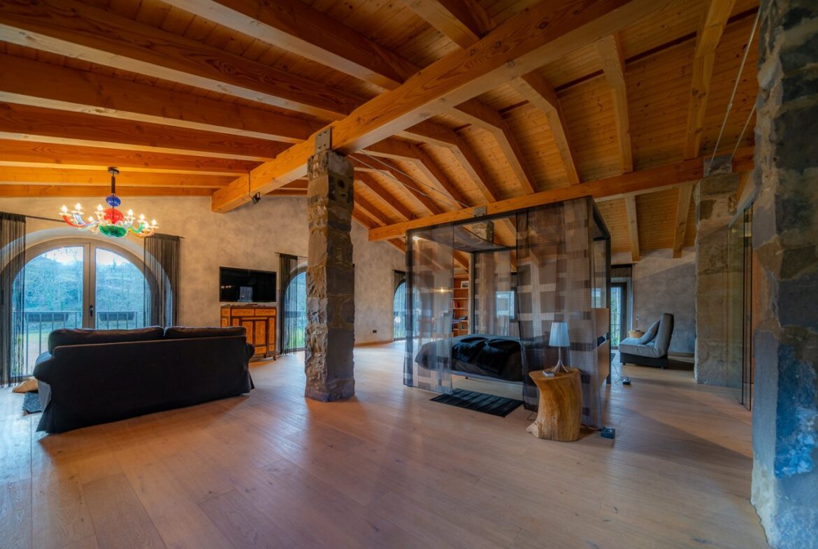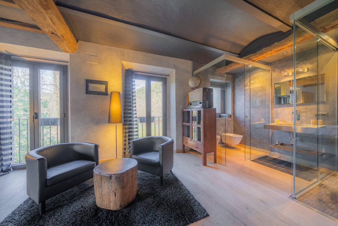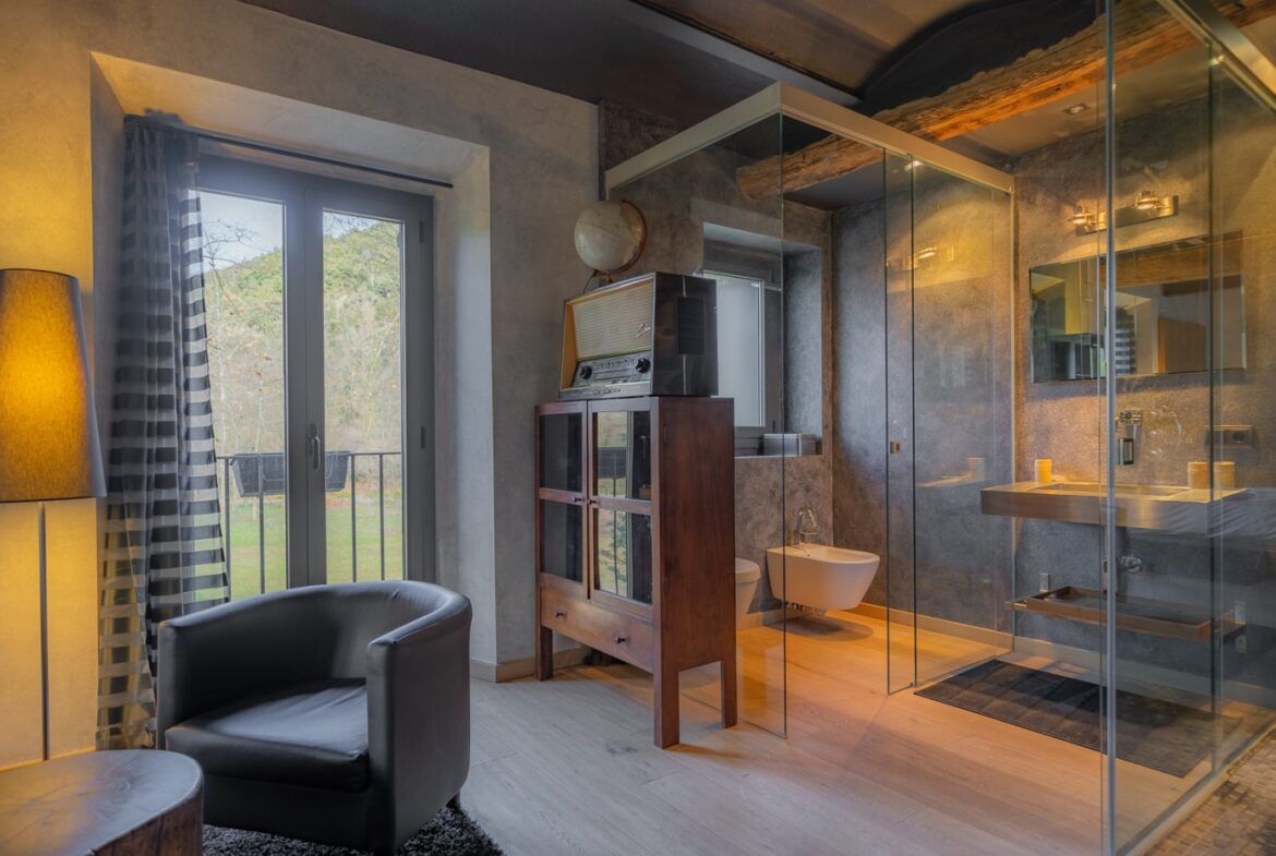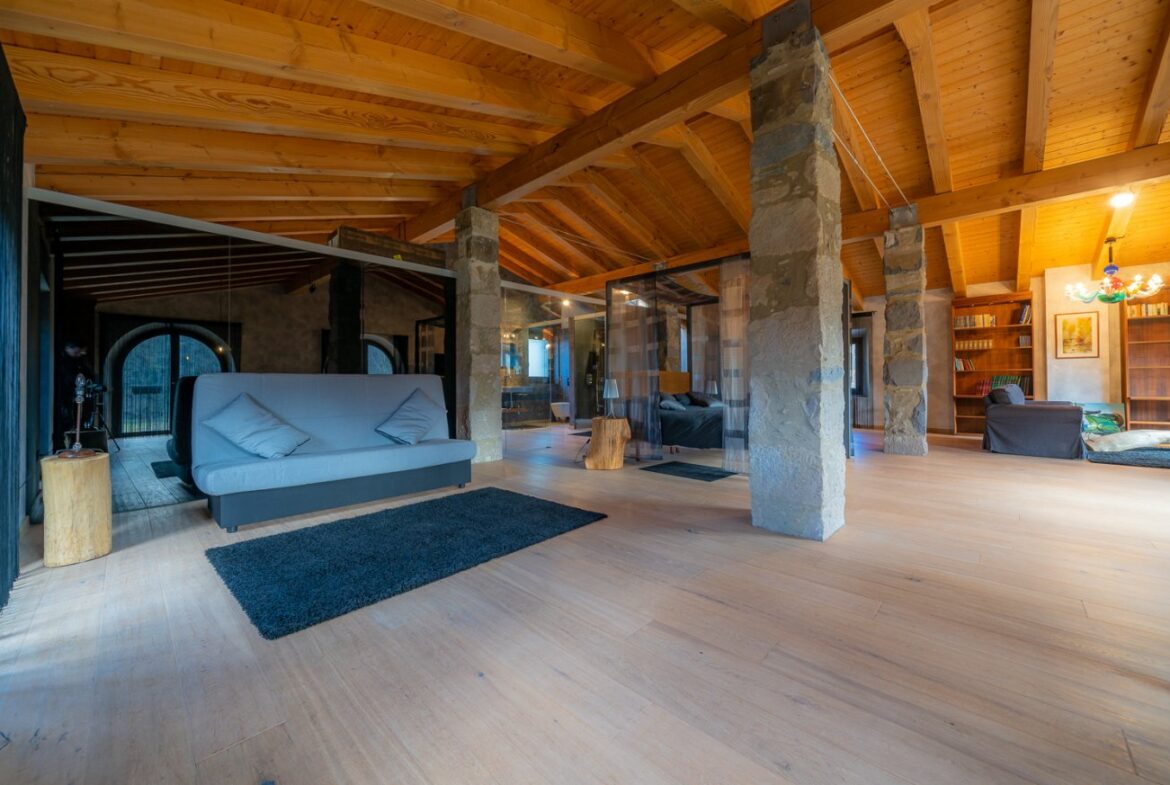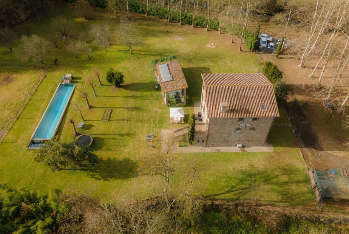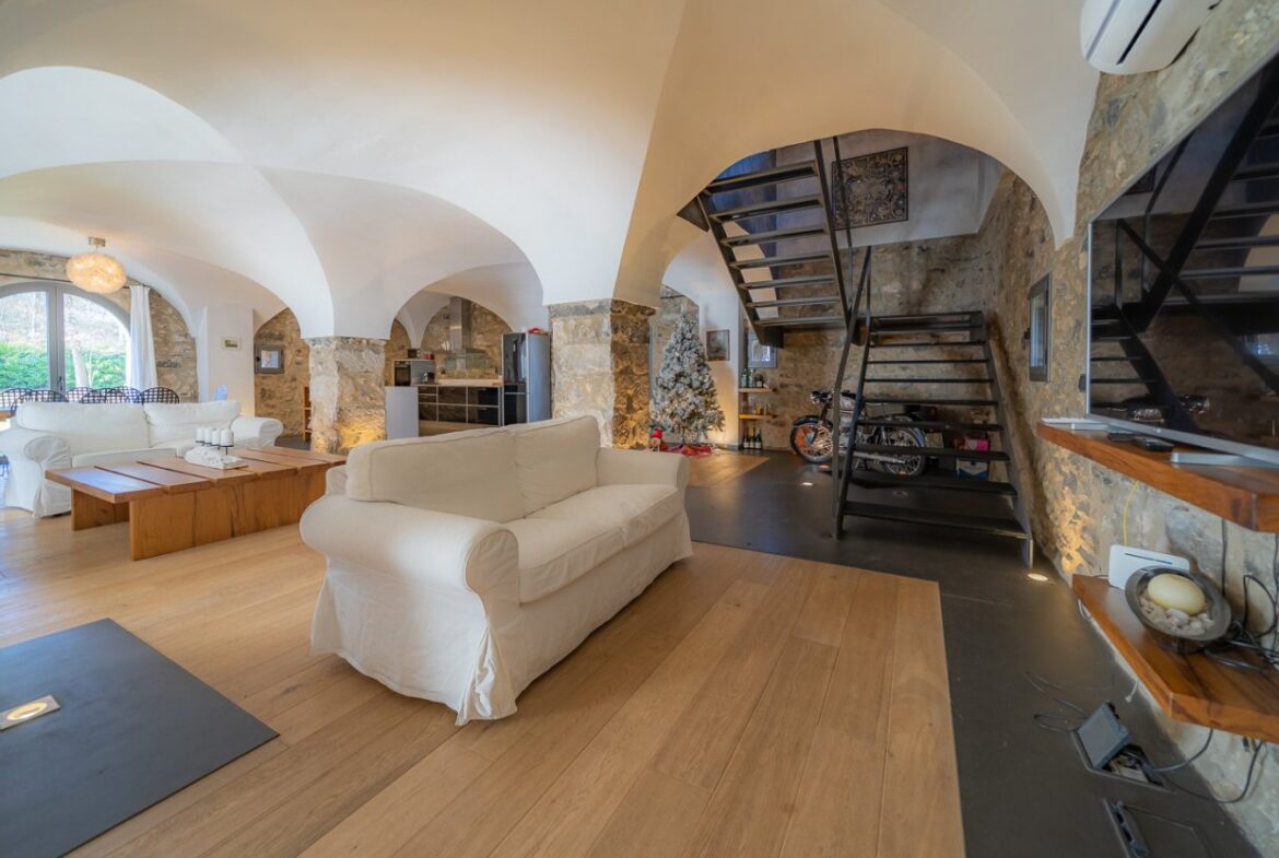 En exclusiva, una masía de arquitectura tradicional catalana totalmente restaurada con muy buen gusto, en la comarca de La Garrotxa, exactamente en Sant Joan Les Fonts y a diez minutos de la ciudad de Olot, con un terreno de casi tres hectáreas.~~La masía dispone de aproximadamente 140 m² cada planta y se distribuye de la siguiente manera:~~En la Planta baja una sala diáfana con varias puertas acristaladas de entrada y salida al exterior de la casa y al jardín, compuesta de salón-comedor con cocina americana, chimenea y baño de cortesía. ~~~En la primera planta encontramos dos suites con sus respectivos baños completos con ducha: Una de aproximadamente 75 m² y la otra de 40 m². La más grande con acceso directo al jardín y piscina.~~En la segunda y última planta, la gran suite de unos 140 m² con baño completo acristalad.~~La propiedad dispone de una piscina interior con agua caliente y otra exterior.~~Es una masía de piedra de un diseño exquisito, moderna y acogedora, en un entorno que no deja indiferente. Una mezcla de paz, comodidad y con los servicios necesarios muy cerca de la ubicación de la propiedad.~Situada en un lugar privilegiado, un territorio con gran valor y gran belleza natural. Muy cerca del parque Natural de la Zona Volcánica de la Garrotxa.~~Dispone de suelo radiante, splits en todas las salas y habitaciones; wifi; piscina interior de agua caliente con placas solares y otra piscina exterior.~~El agua para la piscina y para el riego de todo el terreno proviene de la Font Del Serrat.~~~~~~~~~