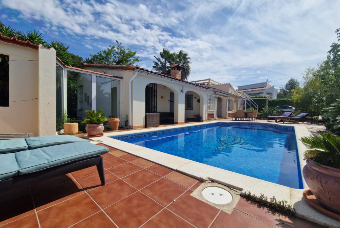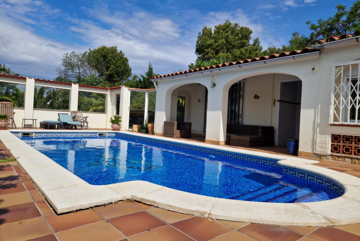 RV46 – Roses, Mas Fumats: Villa independiente de planta baja con piscina, licencia turística, a tan solo 3 km de las playasEn la tranquila y apreciada urbanización de Mas Fumats, en Roses, se encuentra esta villa independiente con piscina privada, ideal para quienes buscan disfrutar del clima mediterráneo, la tranquilidad y la cercanía a las playas de la Costa Brava. La villa cuenta con licencia turística, lo que permite explotarla como alquiler vacacional y generar una renta adicional significativa.La propiedad dispone de 243 m² construidos sobre una parcela de 706 m², ofreciendo amplios espacios exteriores y gran potencial. La vivienda cuenta con 3 dormitorios, incluyendo una suite con baño privado con bañera y ducha, además de un segundo baño completo para los otros dormitorios.El salón-comedor es amplio y luminoso, con chimenea, y se conecta con una cocina totalmente equipada y semiabierta, que podría integrarse completamente para crear un espacio de vida aún más amplio y moderno.La casa está equipada con calefacción de gas ciudad y ventanas de doble acristalamiento, lo que aporta mayor confort durante todo el año.Construida en 1979, la vivienda requiere algunas reformas de actualización para adaptarla a los estándares actuales, lo que representa una excelente oportunidad para personalizarla y crear una casa a su gusto en un entorno privilegiado.En el exterior encontramos un agradable jardín con terraza y zona de barbacoa, perfecto para disfrutar del aire libre durante todo el año, así como una piscina privada de 8 x 4 metros. La vivienda también dispone de un solárium con bonitas vistas al mar.La finca está completamente cerrada, lo que garantiza privacidad y seguridad, y cuenta además con un garaje privado de 34 m².Ubicada a tan solo 3 km de las playas de Roses, con fácil acceso a supermercados, comercios, restaurantes y servicios, esta propiedad representa una excelente oportunidad como residencia habitual, segunda vivienda o inversión en la Costa Brava.Una villa con mucho potencial, en un entorno natural privilegiado, perfecta para transformarla en el hogar ideal.Contácte a Remax Brava para más información o para organizar una visita.~