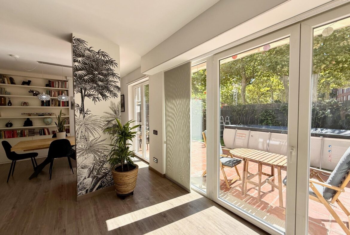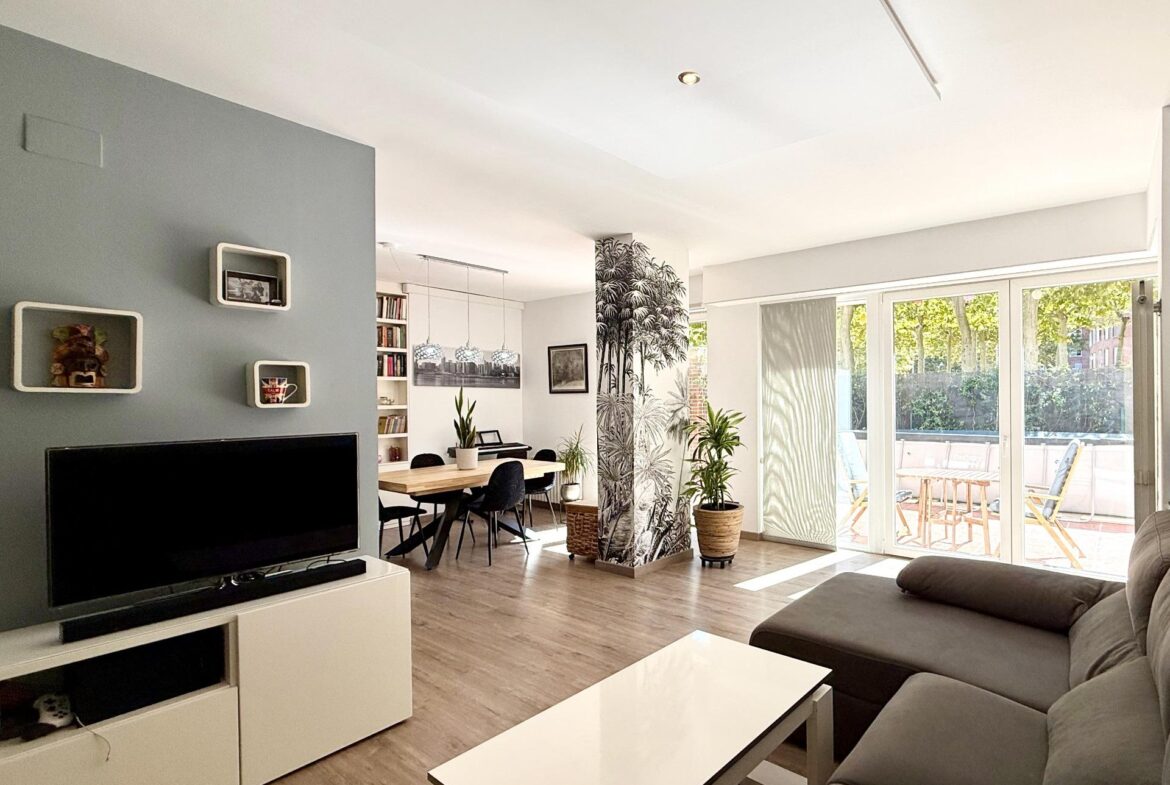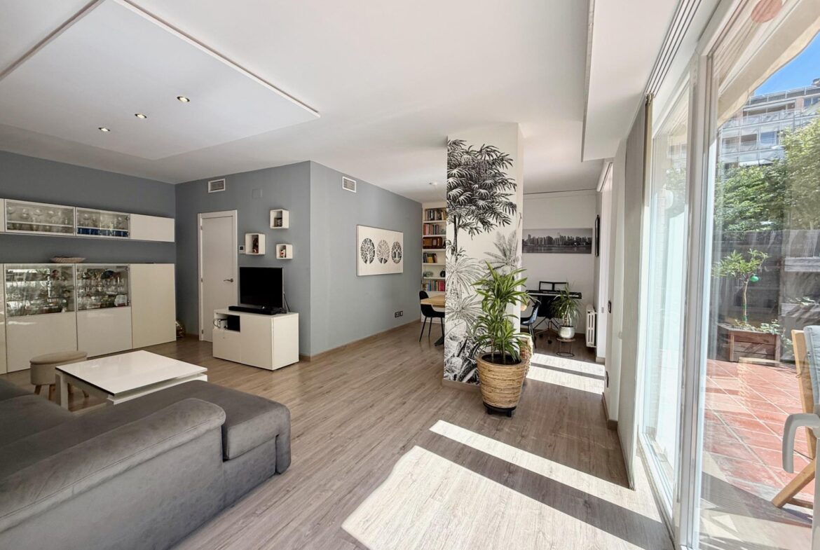 En una entreplanta elevada y luminosa, se encuentra esta atractiva vivienda que destaca por su fantástica terraza de 53 m², orientada hacia el tranquilo parque interior de la comunidad. Un espacio exterior soleado, silencioso y privado — ideal para familias, reuniones o simplemente para disfrutar del clima mediterráneo.~~La propiedad fue reformada íntegramente hace 6 años por una interiorista, combinando diseño contemporáneo con funcionalidad. Dispone de un amplio salón-comedor en concepto abierto, con zonas claramente diferenciadas y una atmósfera cálida y acogedora.~~Características principales:~•3 dormitorios exteriores con armarios empotrados~•2 baños completos~•Cocina totalmente equipada con barra de desayuno~•Aire acondicionado frío/calor~•Calefacción central por gas~•Carpintería exterior con doble acristalamiento y apertura oscilo-batiente~•Plaza de garaje opcional con Wallbox para coche eléctrico~•Finca con portería 24h y patio interior con zona de juegos infantil~~Ubicación:~~Situada en el corazón de la Vila Olímpica, esta vivienda ofrece una combinación ideal de tranquilidad, seguridad y cercanía al mar. A pocos minutos caminando de la playa y rodeada de servicios, colegios, zonas verdes y transporte público, es una opción perfecta para familias que buscan calidad de vida en una de las zonas más agradables de Barcelona.~~